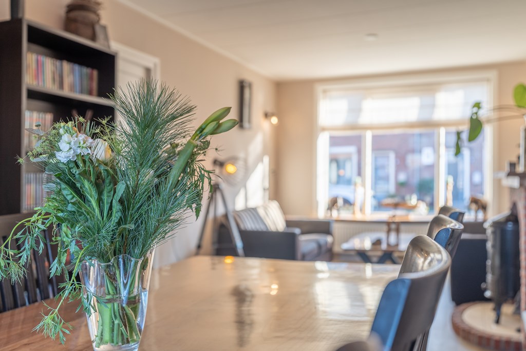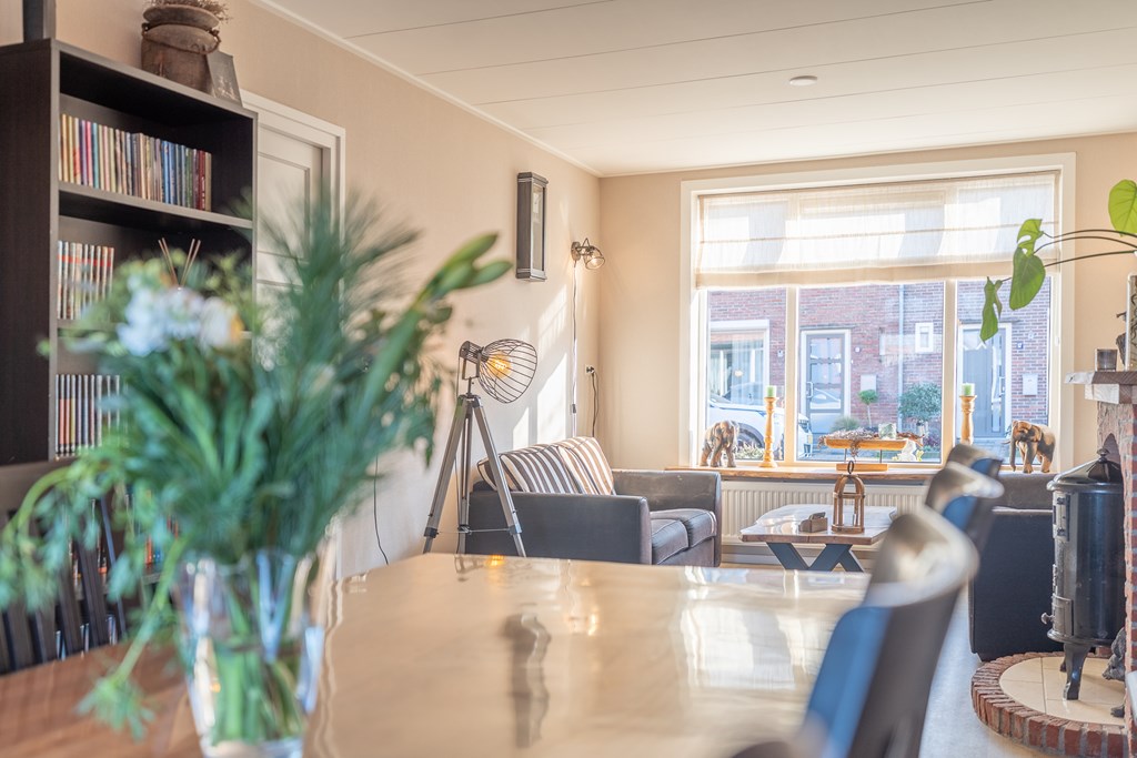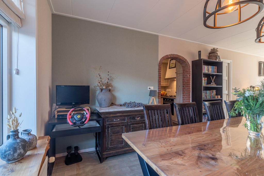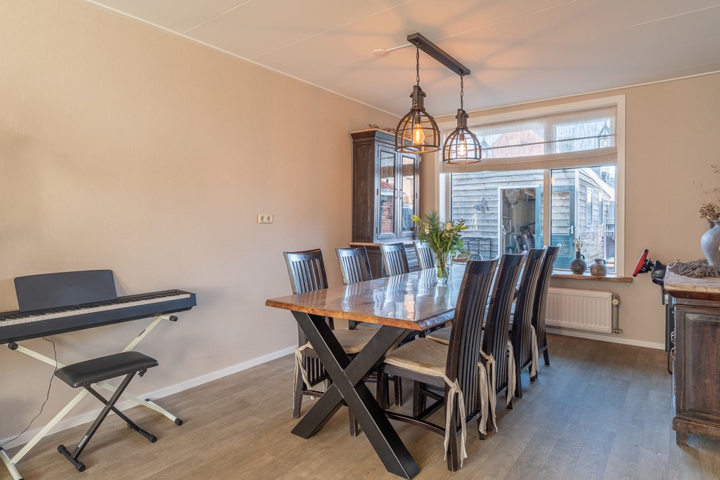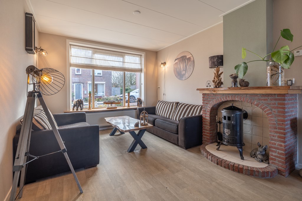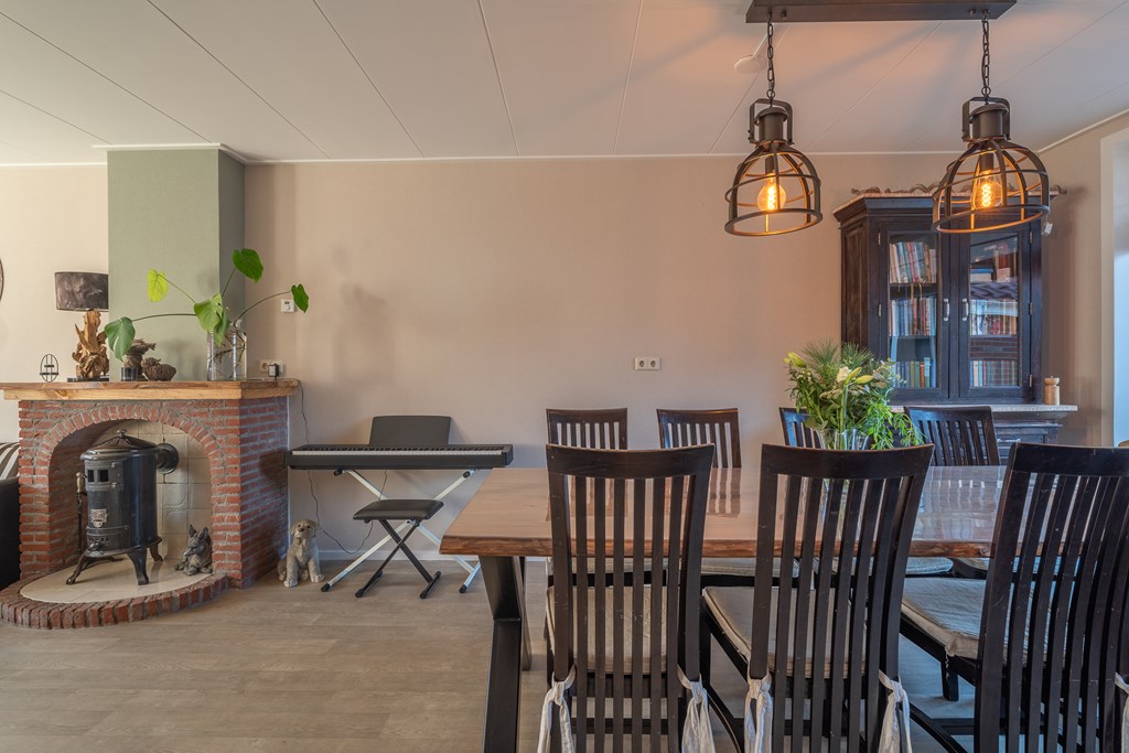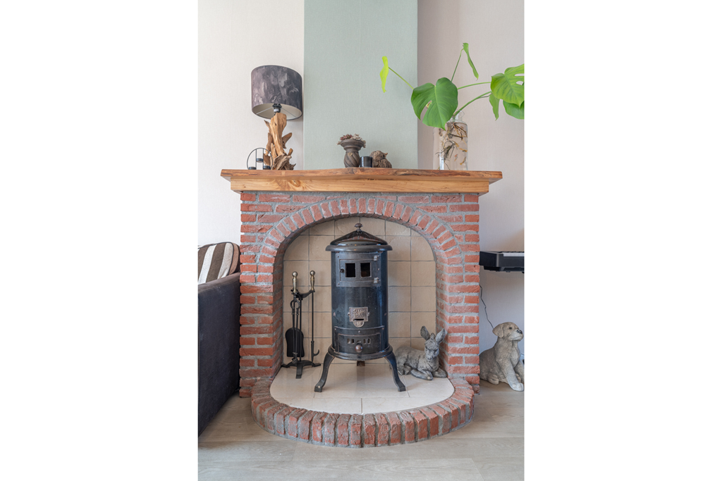 De doorzonwoonkamer is licht en ruim, met grote ramen aan zowel de voor- als achterzijde. Er is voldoende ruimte voor een comfortabele zithoek en een eethoek. De aanwezige schouw met houtkachel zorgt voor extra sfeer in de woonkamer.