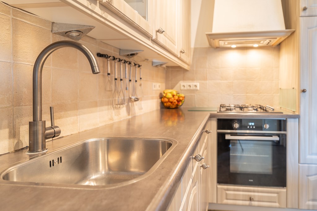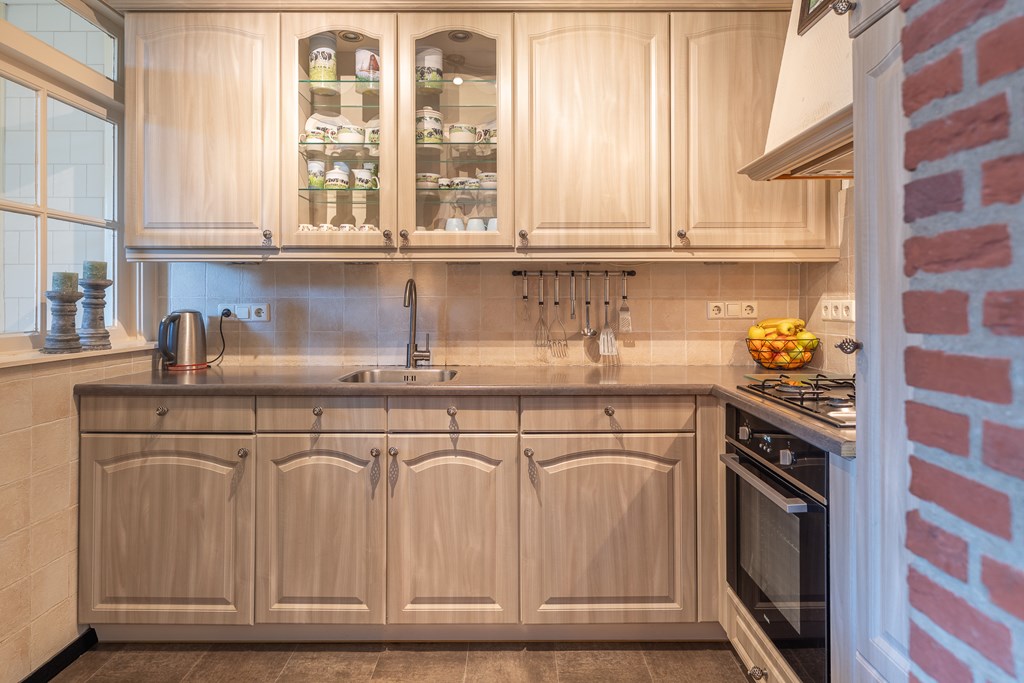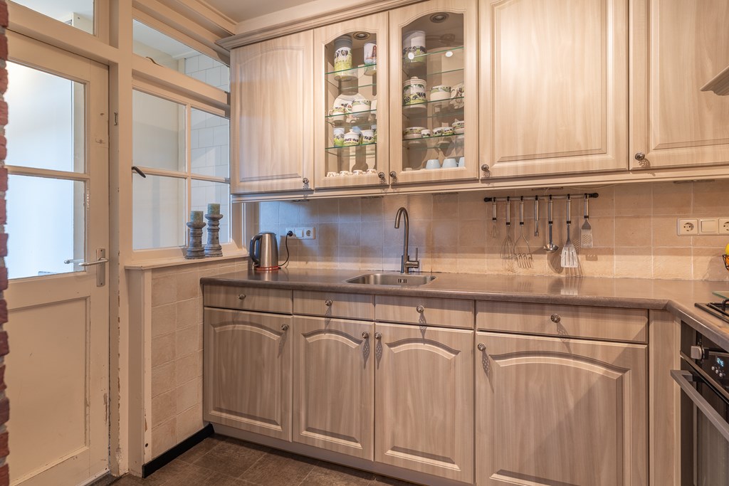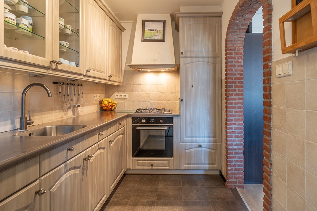 Aansluitend bevindt zich de gesloten keuken, uitgevoerd in een lichte kleurstelling en praktisch ingericht met inbouwapparatuur en voldoende werk- en kastruimte.