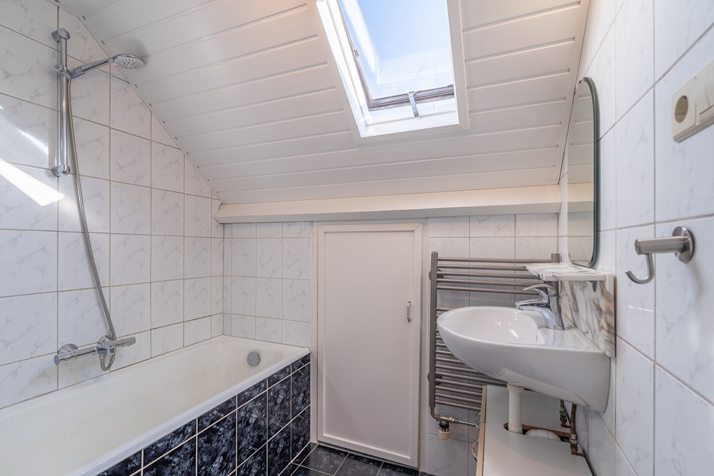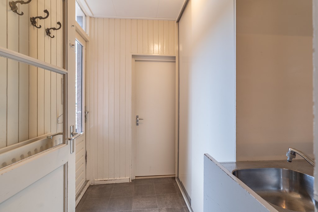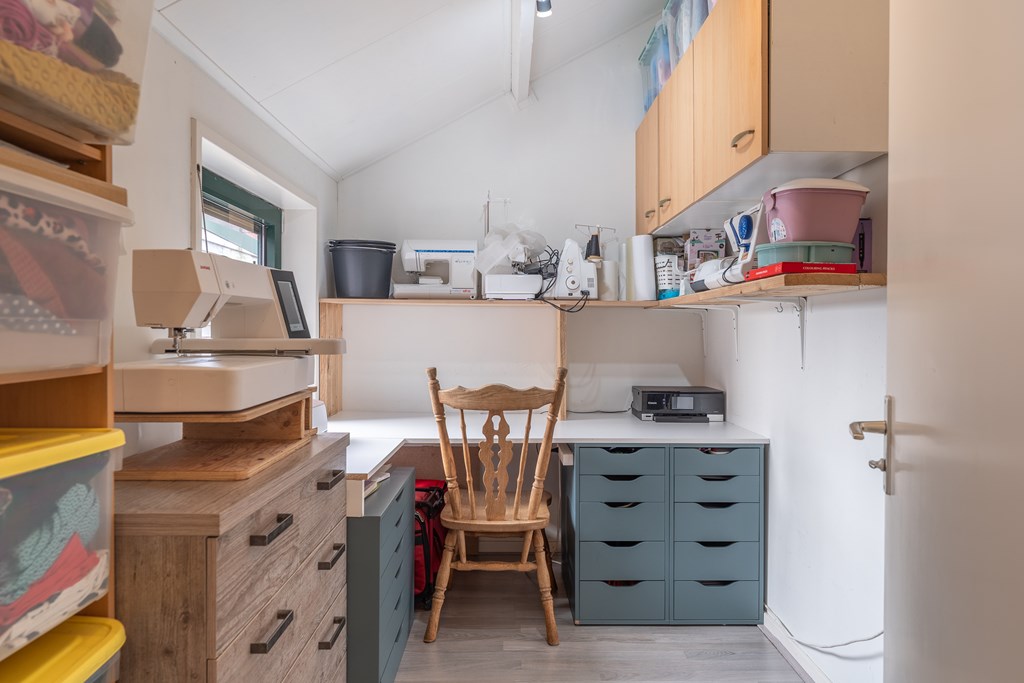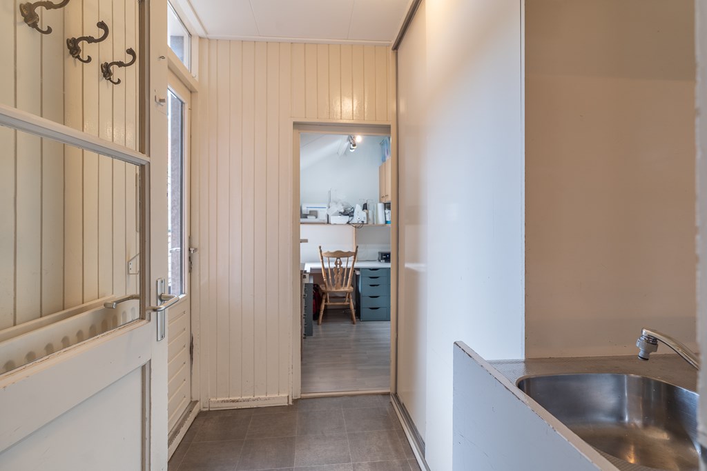 Achter de keuken ligt de bijkeuken, waar zich de witgoedaansluitingen bevinden en die toegang biedt tot de achtertuin. Vanuit de bijkeuken is er daarnaast toegang tot een aparte hobby-/werkkamer, een praktische extra ruimte die geschikt is voor werken aan huis, hobbygebruik of extra bergruimte.