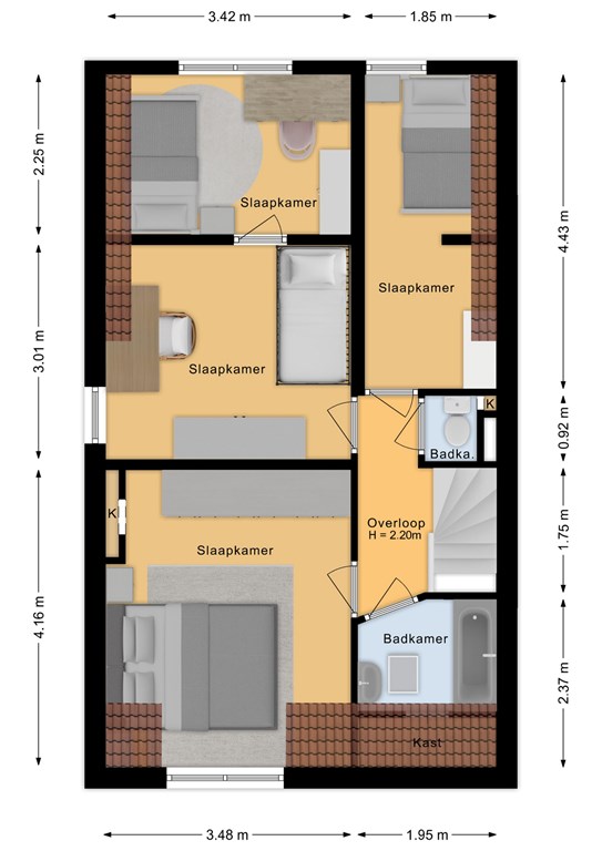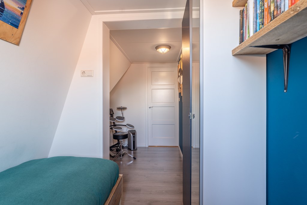 Op de eerste verdieping bevinden zich vier slaapkamers, die verschillen in grootte en daardoor op verschillende manieren te gebruiken zijn. Daarnaast is er een badkamer met ligbad, douche en wastafel, voorzien van een dakraam. Op de overloop is tevens een separaat tweede toilet aanwezig.