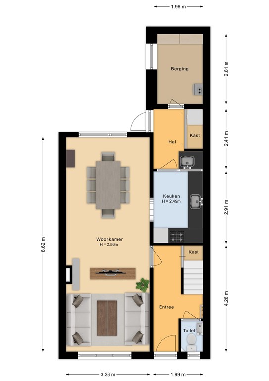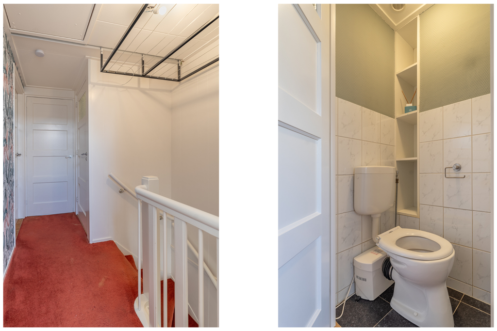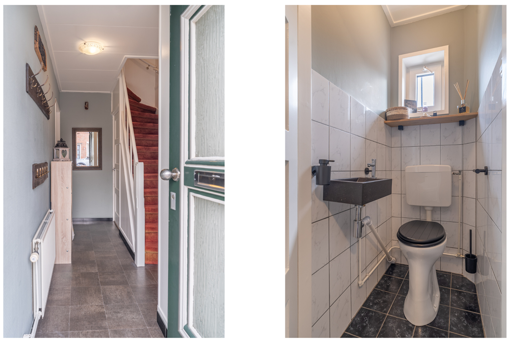 Via de entree aan de voorzijde komt u binnen in de hal met meterkast, toilet en trapopgang. Het toilet is netjes afgewerkt en voorzien van een fonteintje.
