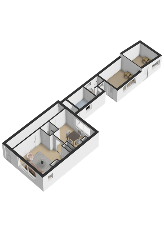 Via de voordeur bereikt u de hal met trapopgang. Aan de voorzijde ligt de gezellige woonkamer met gaskachel en grote raampartijen die zorgen voor veel lichtinval. Aansluitend bevindt zich de eethoek, voorzien van praktische vaste kasten. Vanuit de hal bereikt u de keuken, die is uitgerust met een gaskookplaat, afzuigkap en geiser voor warm water. Achter de keuken ligt de badkamer met douche, wastafel en toilet.