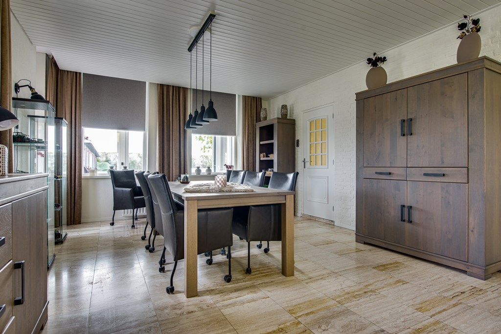 Aan de voorzijde bevindt zich de lichte woonkamer, met grote ramen die zorgen voor een prettige hoeveelheid daglicht en uitzicht over de tuin. De aangrenzende eetkamer vormt samen met de woonkamer een fijne, open leefruimte met volop mogelijkheden voor een grote eettafel of gezellige zithoek.