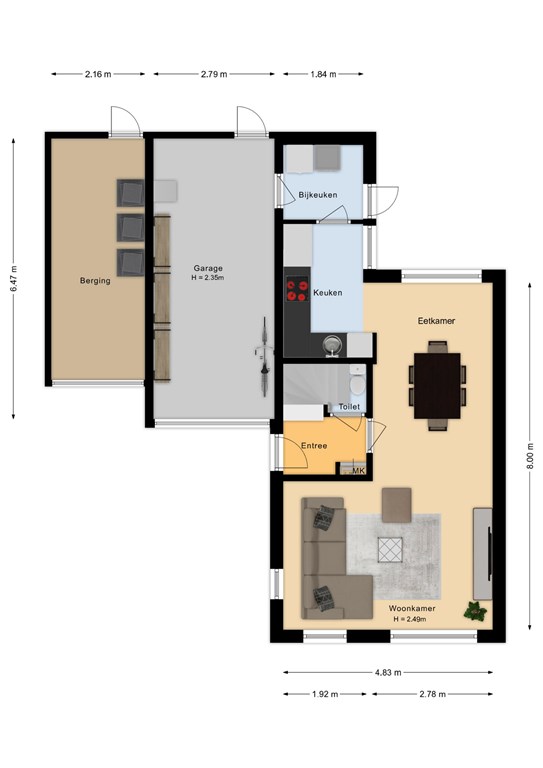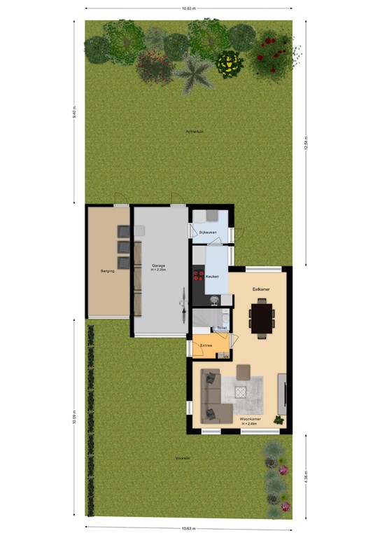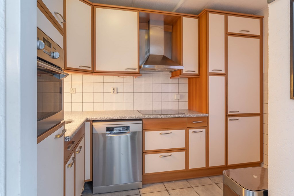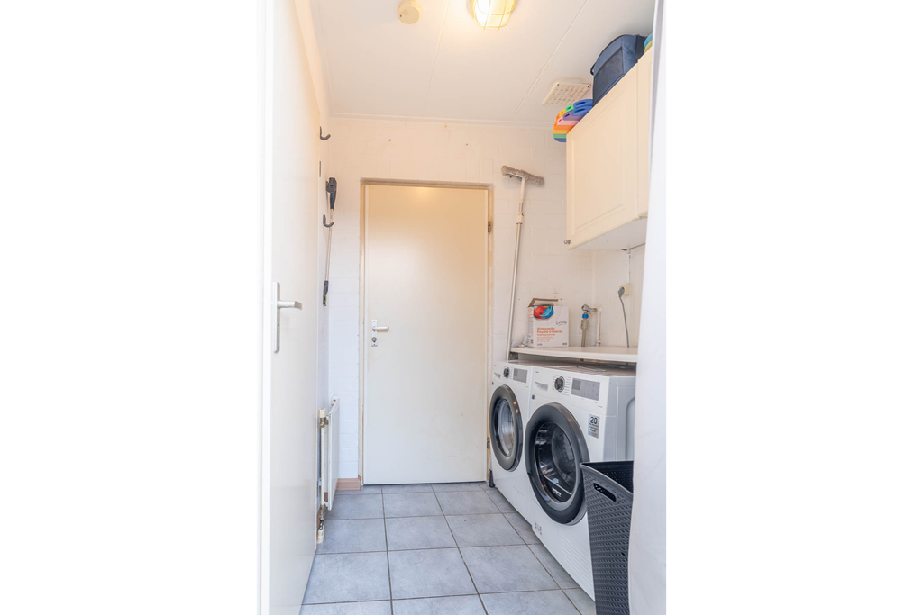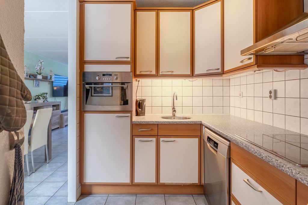 De keuken is praktisch ingericht en grenst aan de bijkeuken. Vanuit de bijkeuken is er toegang tot zowel de achtertuin als de garage. De garage en de losse berging zijn daarnaast ook via de achtertuin bereikbaar, wat het geheel extra praktisch maakt.