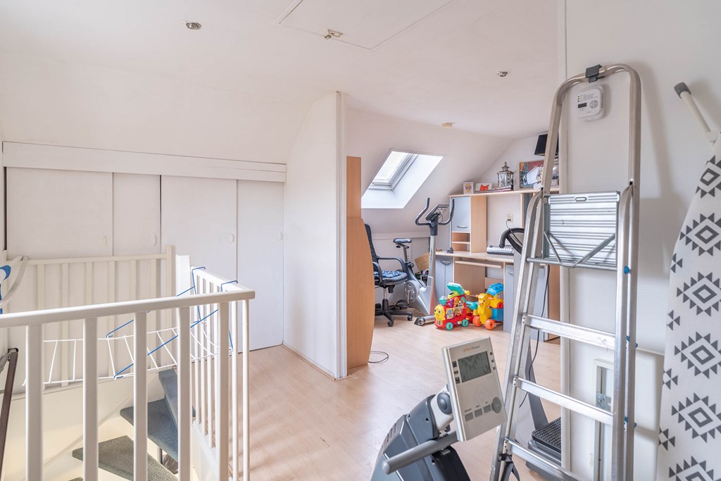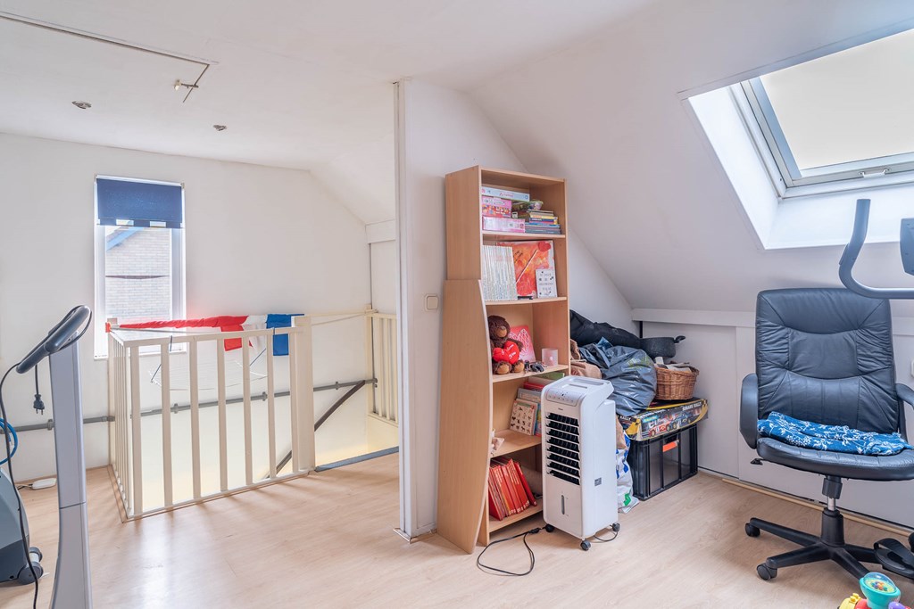 Via een vaste trap bereik je de tweede verdieping. Hier bevindt zich een ruime overloop en een extra slaapkamer met dakraam. Daarnaast is er praktische bergruimte achter de knieschotten aanwezig.