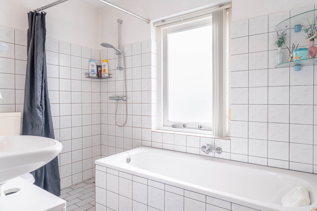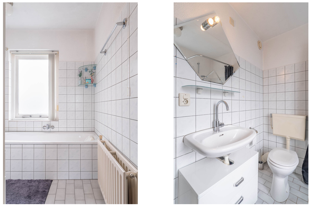 De badkamer is volledig betegeld en voorzien van een ligbad, douche, wastafel en toilet.