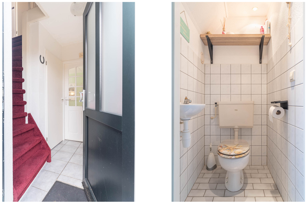 Via de entree kom je binnen in de hal met meterkast, toiletruimte en trapopgang naar de verdieping.