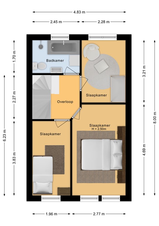 Op de eerste verdieping bevinden zich drie slaapkamers en de badkamer.