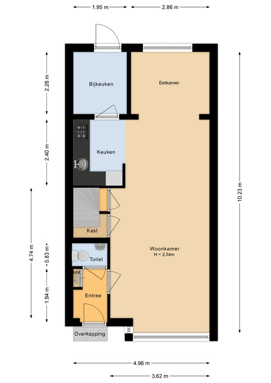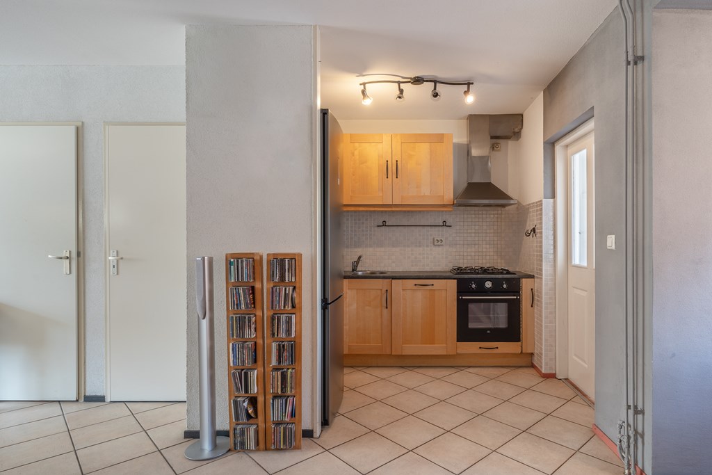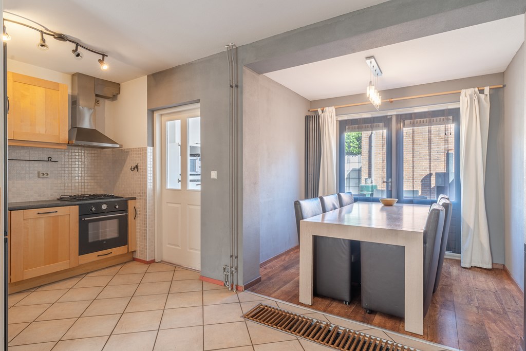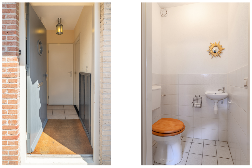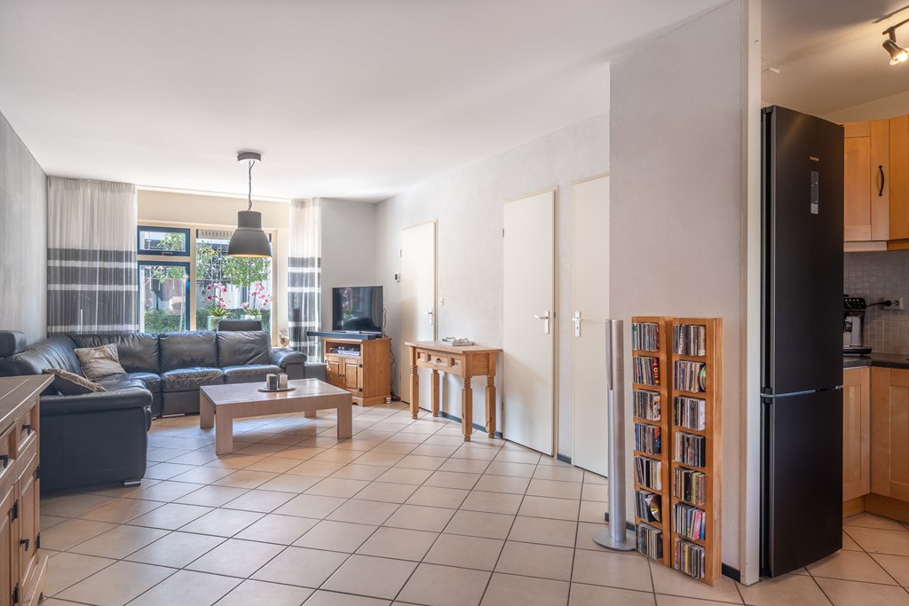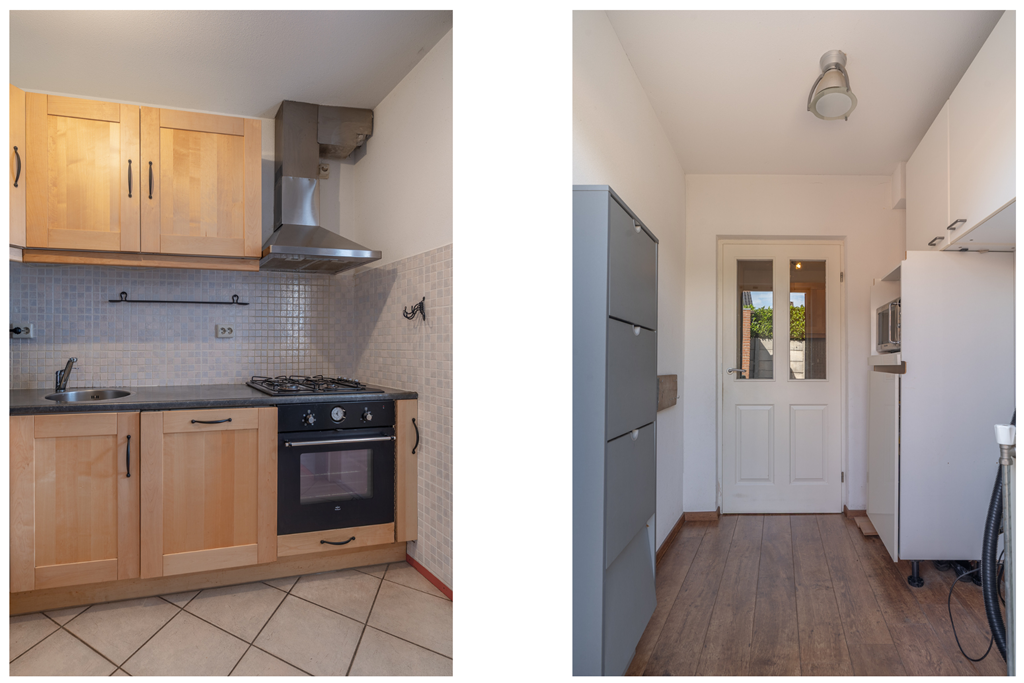 Via de entree met meterkast en toilet kom je in de ruime woonkamer. Dankzij de grote raampartij aan de voorzijde en de lichte tegelvloer met vloerverwarming is dit een fijne en lichte leefruimte. Aan de achterzijde bevindt zich de eetkamer met openslaande deuren naar de tuin. De halfopen keuken is uitgevoerd in een hoekopstelling en voorzien van de gebruikelijke inbouwapparatuur. Aansluitend ligt de bijkeuken, met extra bergruimte en een tweede deur naar de tuin. Onder de trap bevindt zich een handige trapkast.