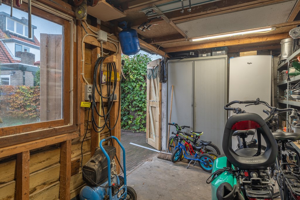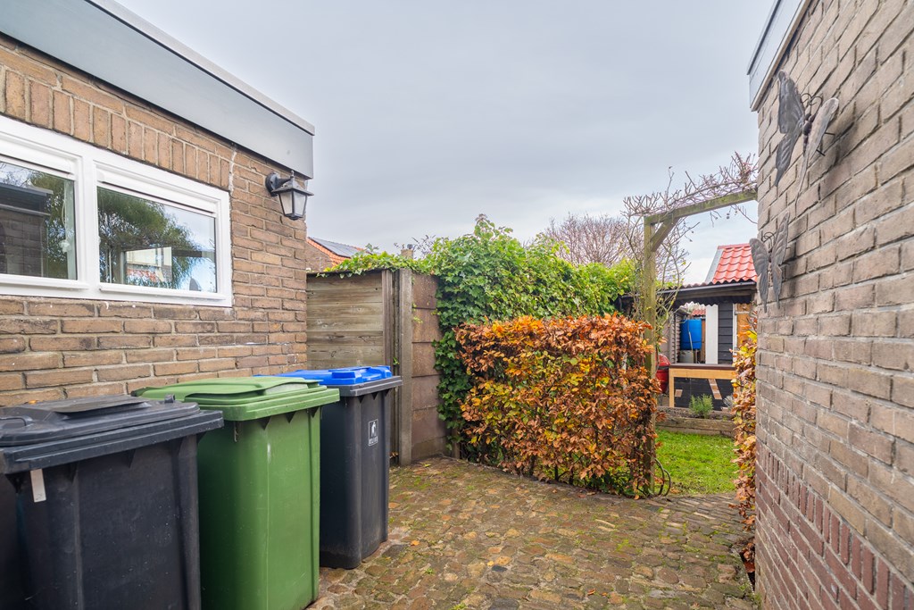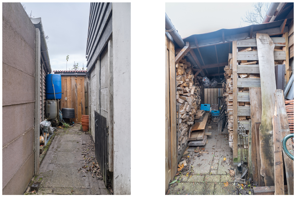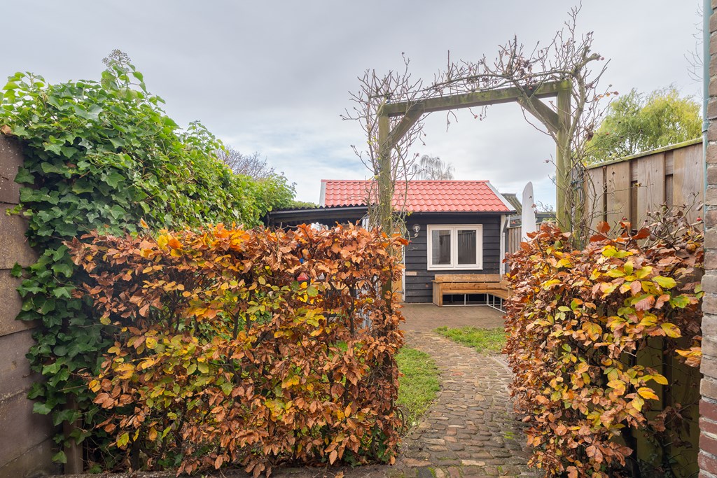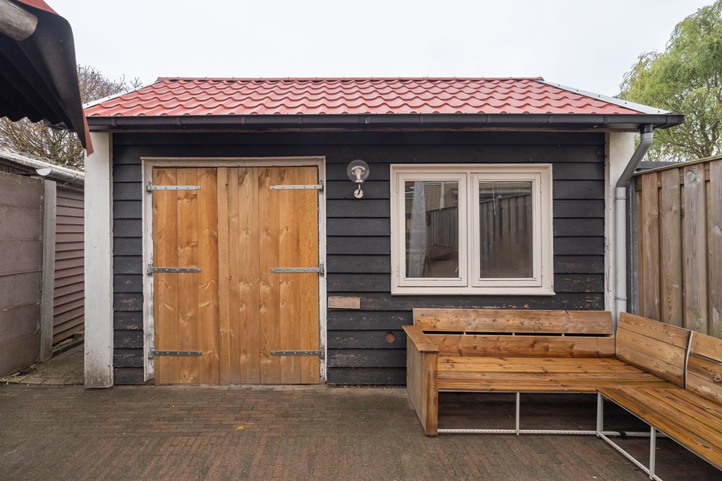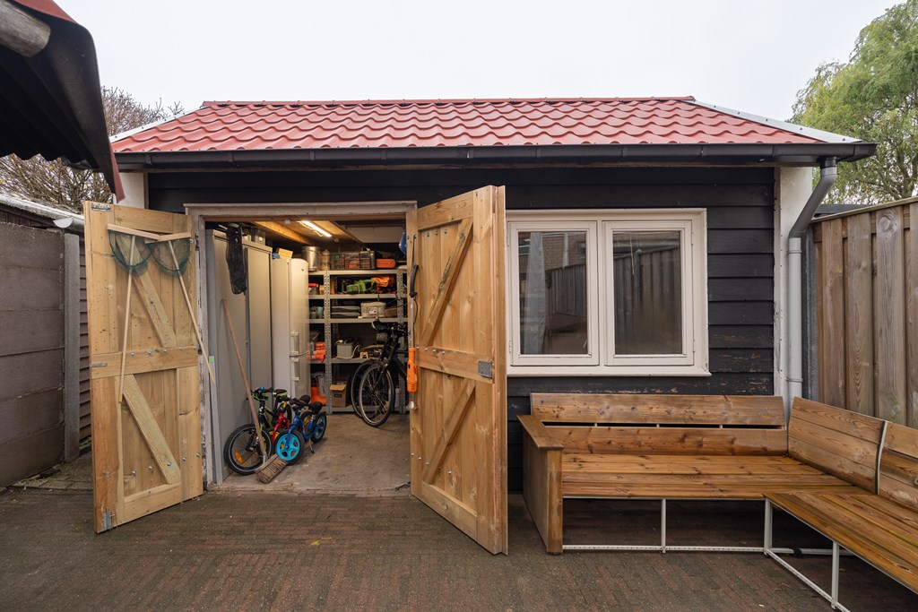 De achtertuin is verrassend diep en speels van vorm. Er is plek voor meerdere groene zones én een terras. Achterin de tuin staat een vrijstaande houten schuur (ca. 9 m²), ideaal voor opslag of het uitoefenen van een hobby. Via een pad naast de woning bereikt u de tuin via de achterom.