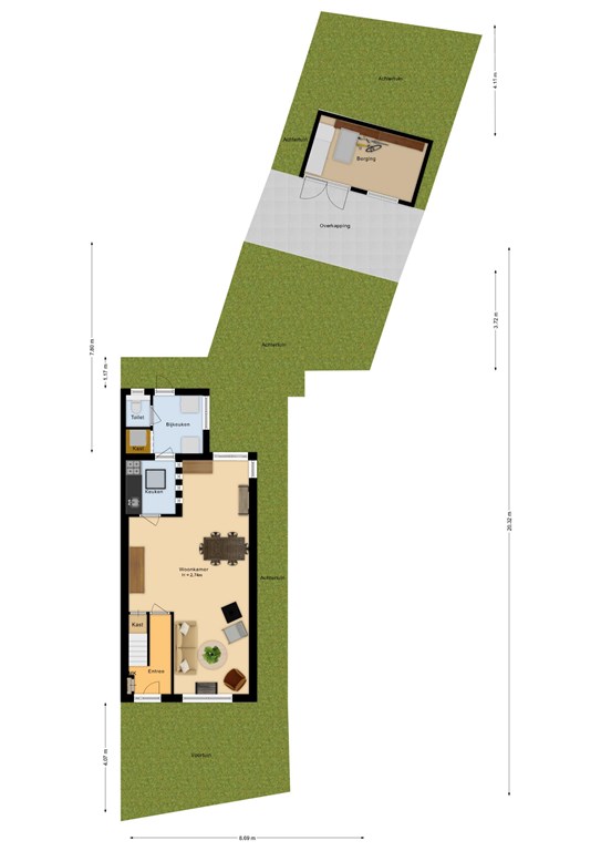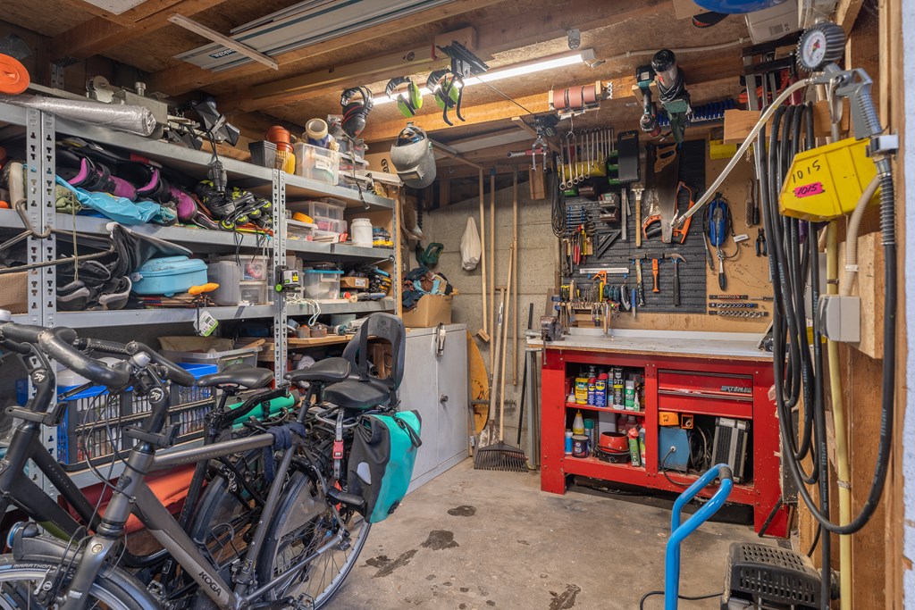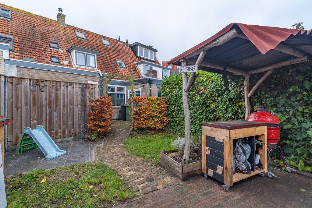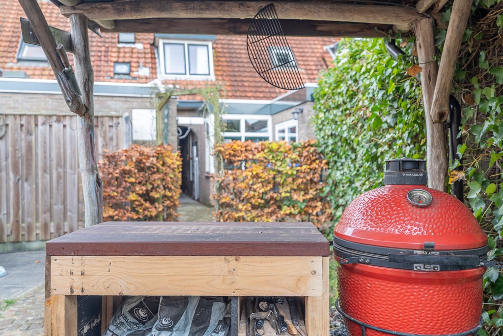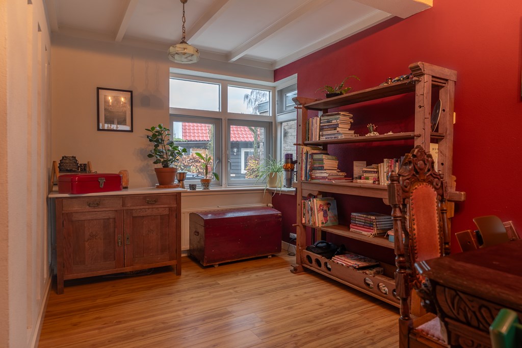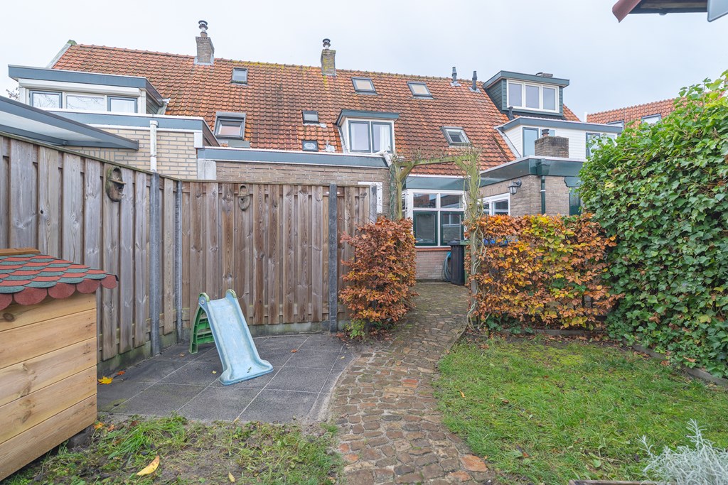 De achtertuin is verrassend diep en speels van vorm. Er is plek voor meerdere groene zones én een terras. Achterin de tuin staat een vrijstaande houten schuur (ca. 9 m²), ideaal voor opslag of het uitoefenen van een hobby. Via een pad naast de woning bereikt u de tuin via de achterom.
