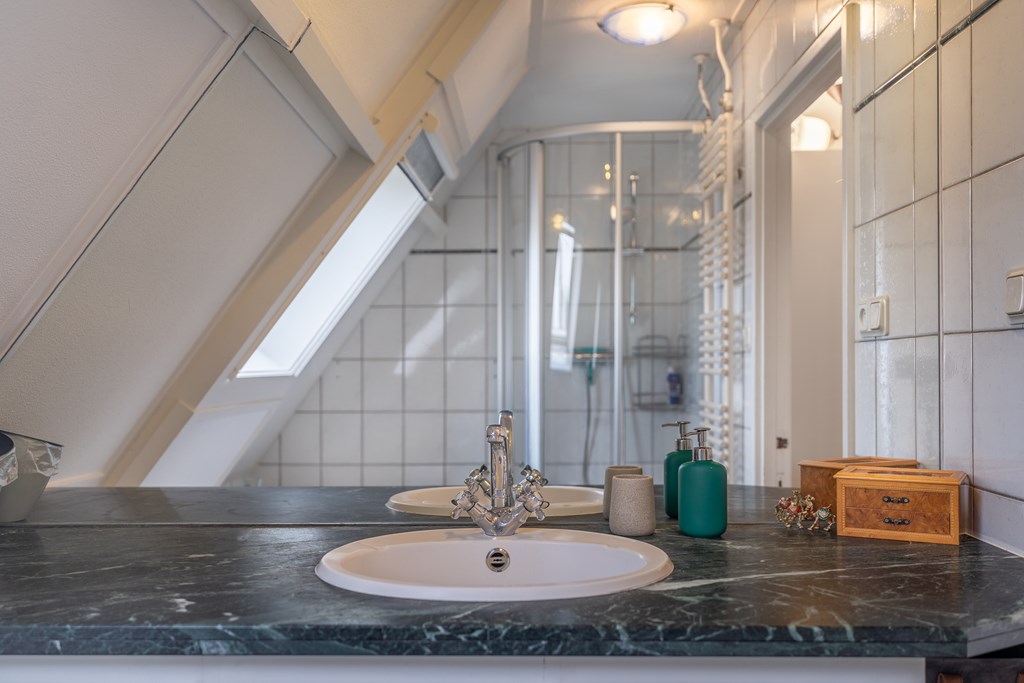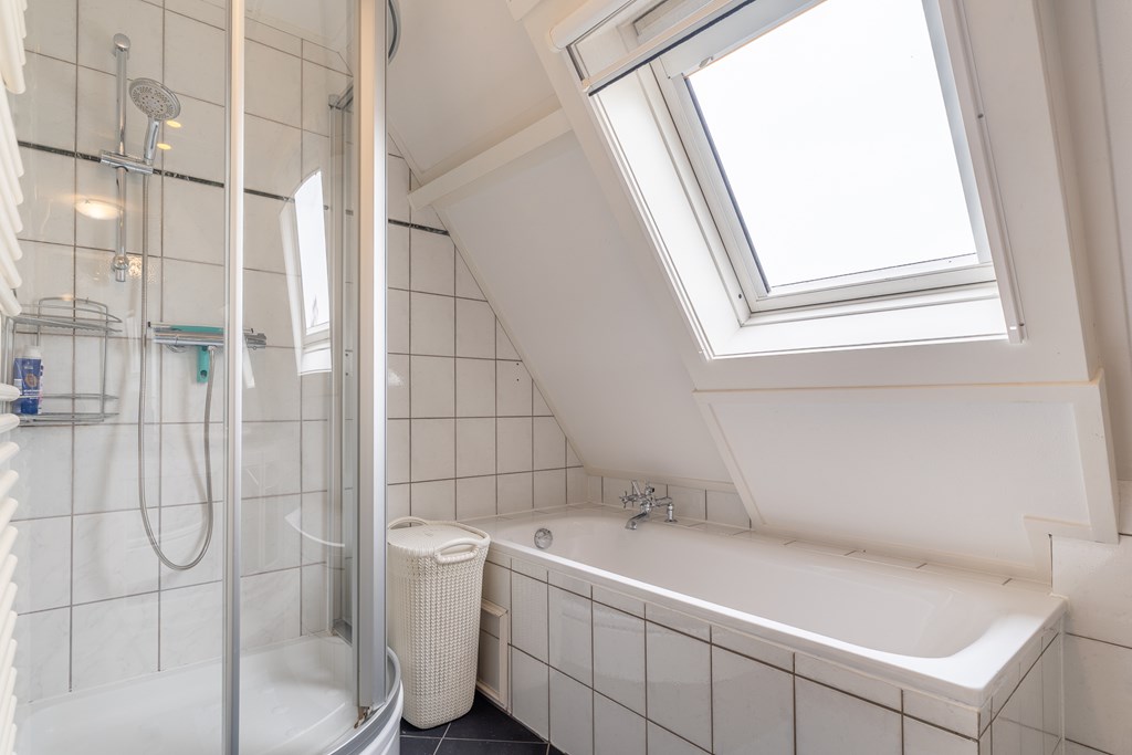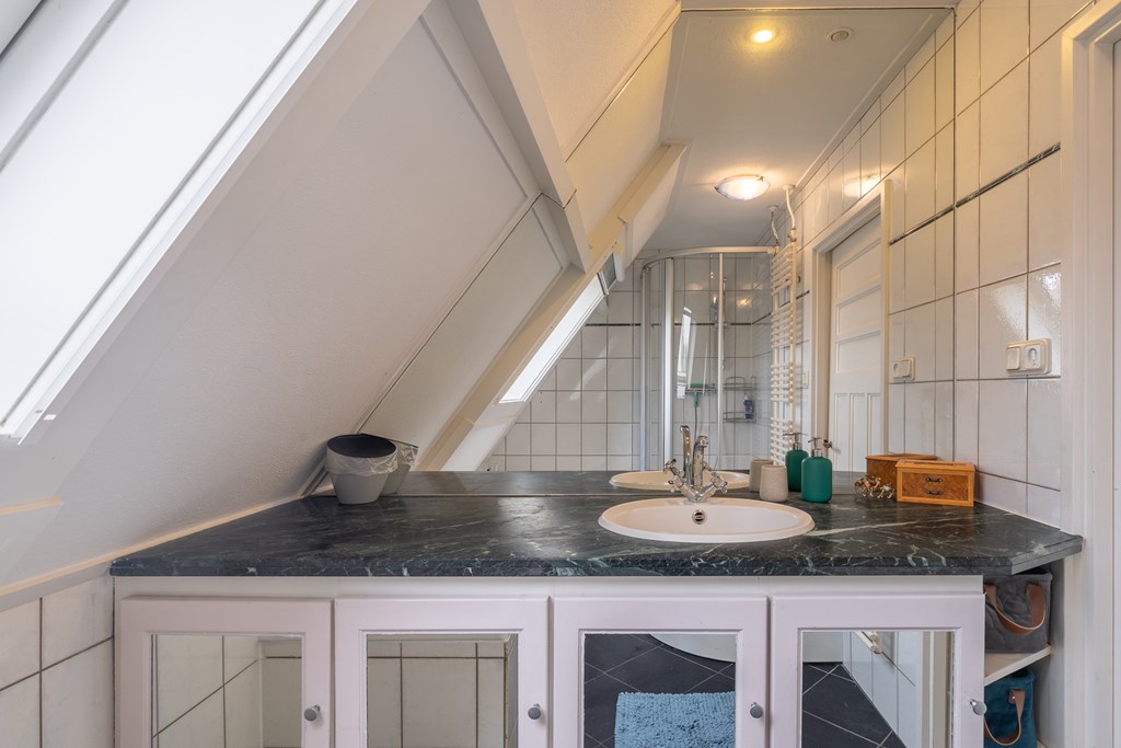 Op de eerste verdieping bevinden zich twee ruime slaapkamers, beide met fijne lichtinval en een prettig formaat. De badkamer is compleet uitgevoerd met een dubbele wastafel, douchecabine, ligbad en een groot raam voor natuurlijke ventilatie.
