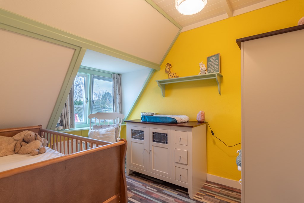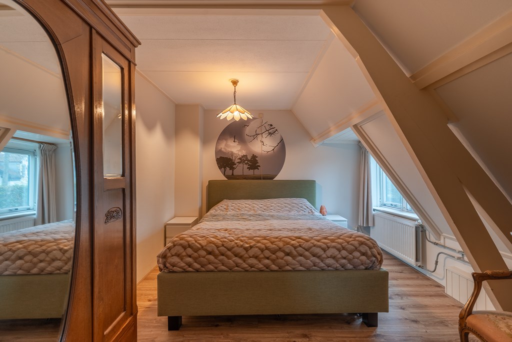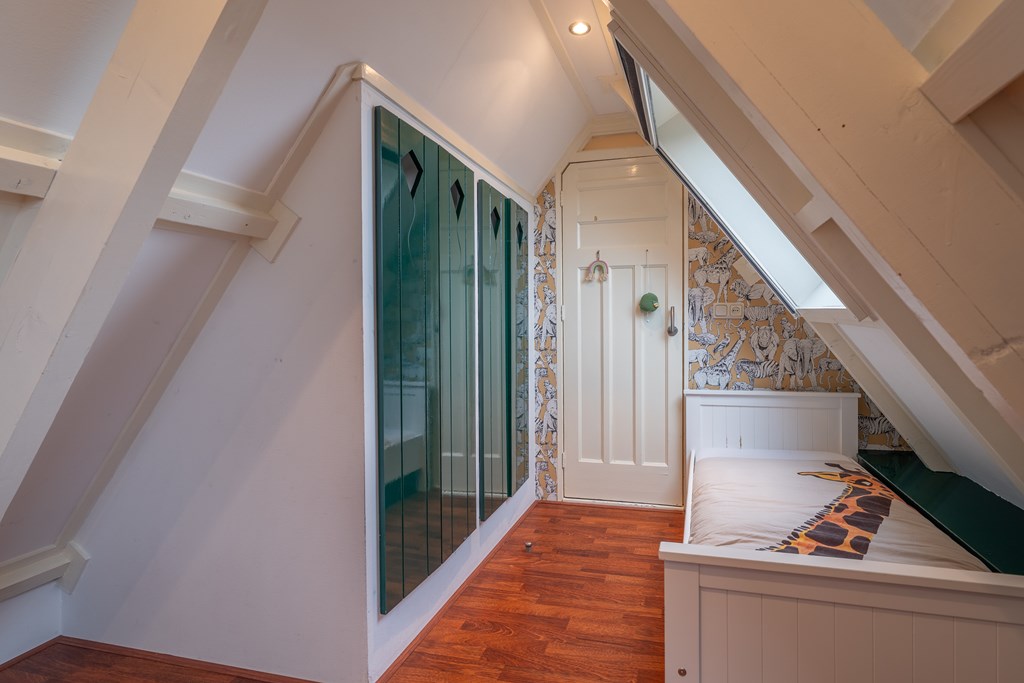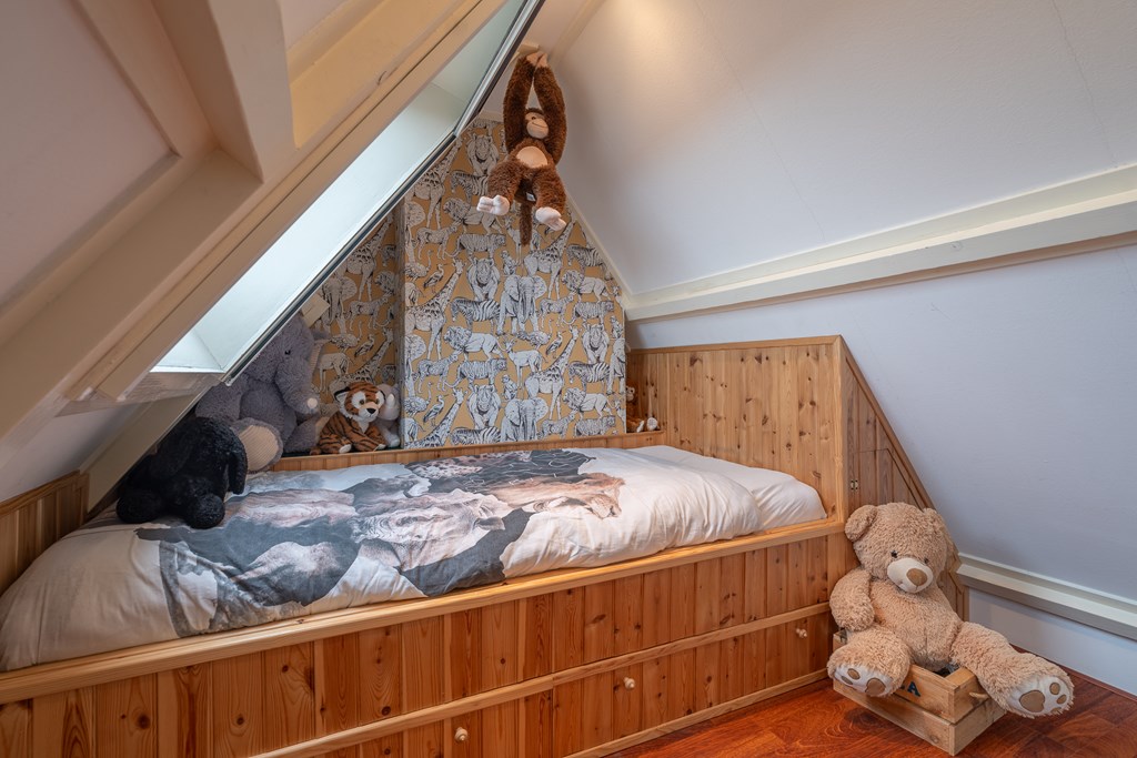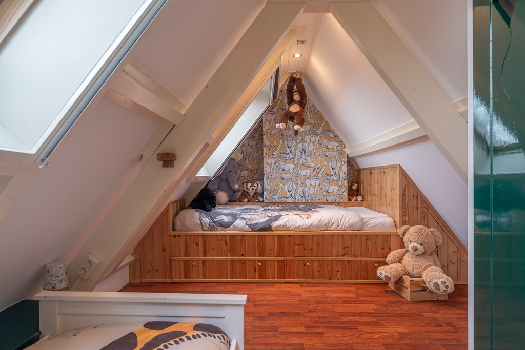 Een vaste trap leidt naar de tweede verdieping, waar zich de derde slaapkamer bevindt. Deze verdieping is voorzien van twee dakramen en handige bergruimte achter de knieschotten. Een sfeervolle kamer met extra ruimte, ideaal als slaap- of hobbykamer.