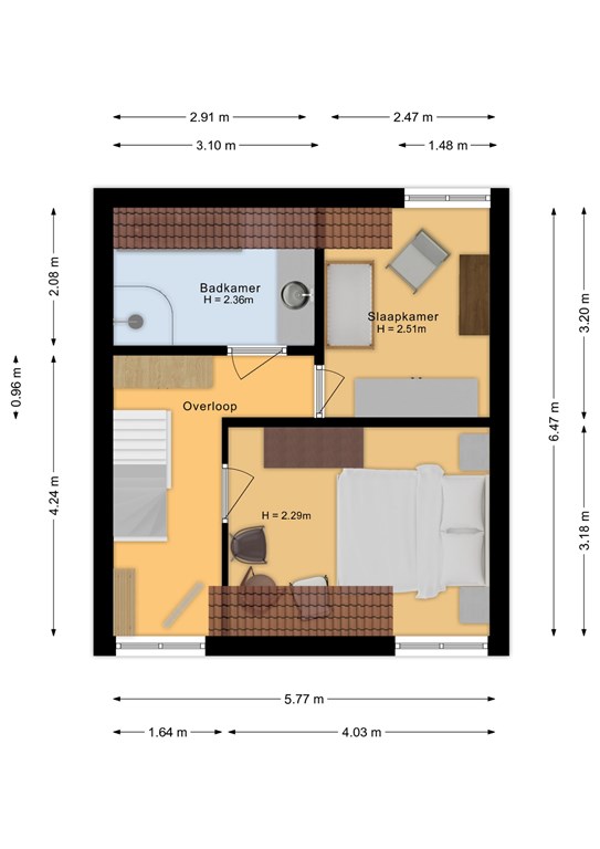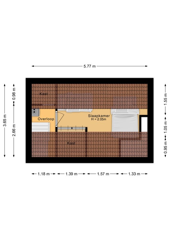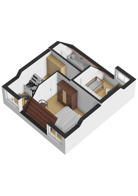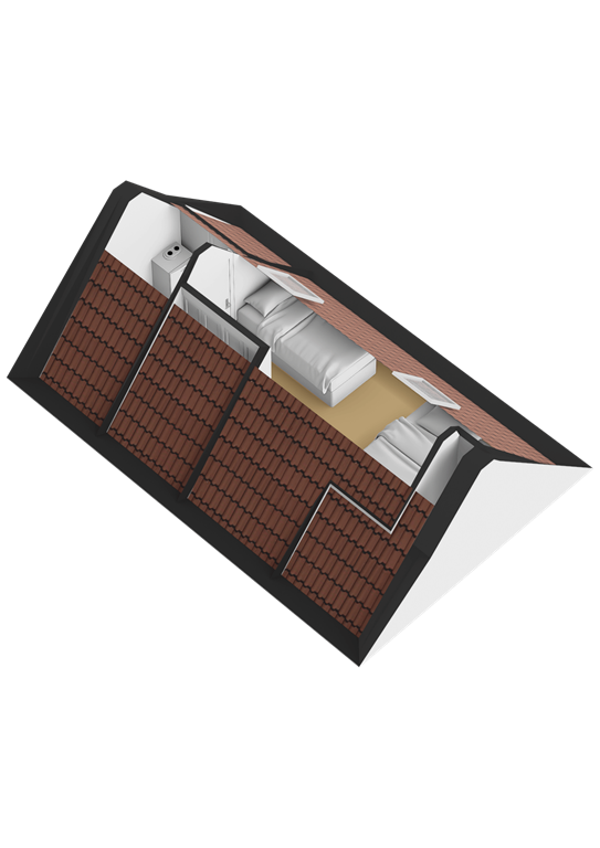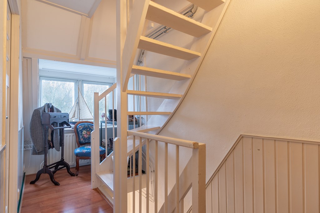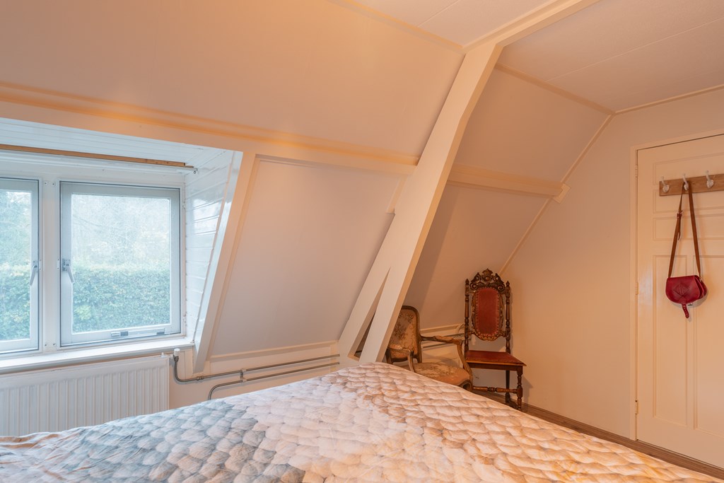 Een vaste trap leidt naar de tweede verdieping, waar zich de derde slaapkamer bevindt. Deze verdieping is voorzien van twee dakramen en handige bergruimte achter de knieschotten. Een sfeervolle kamer met extra ruimte, ideaal als slaap- of hobbykamer.