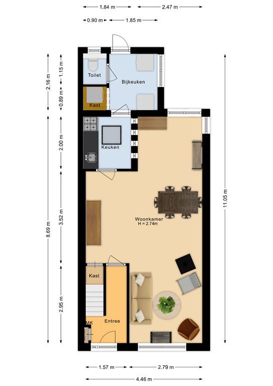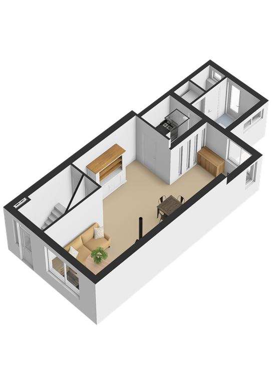 Binnenkomen doet u in de hal met meterkast, trapopgang en toegang tot de woonkamer. De woonkamer is een fijne, lichte ruimte met een prettige indeling voor zowel een zithoek als een eettafel. De grote ramen zorgen voor veel daglicht en geven de kamer een ruimtelijk gevoel.