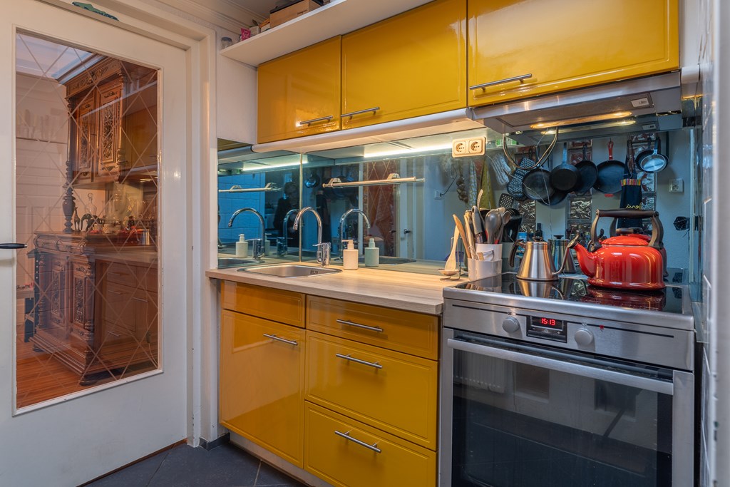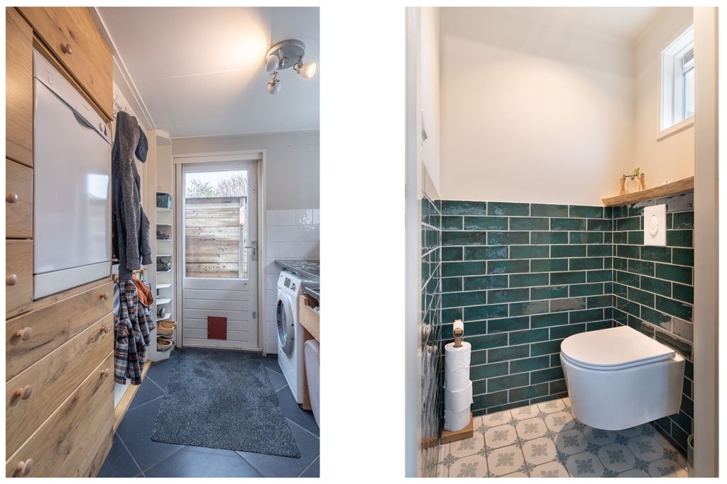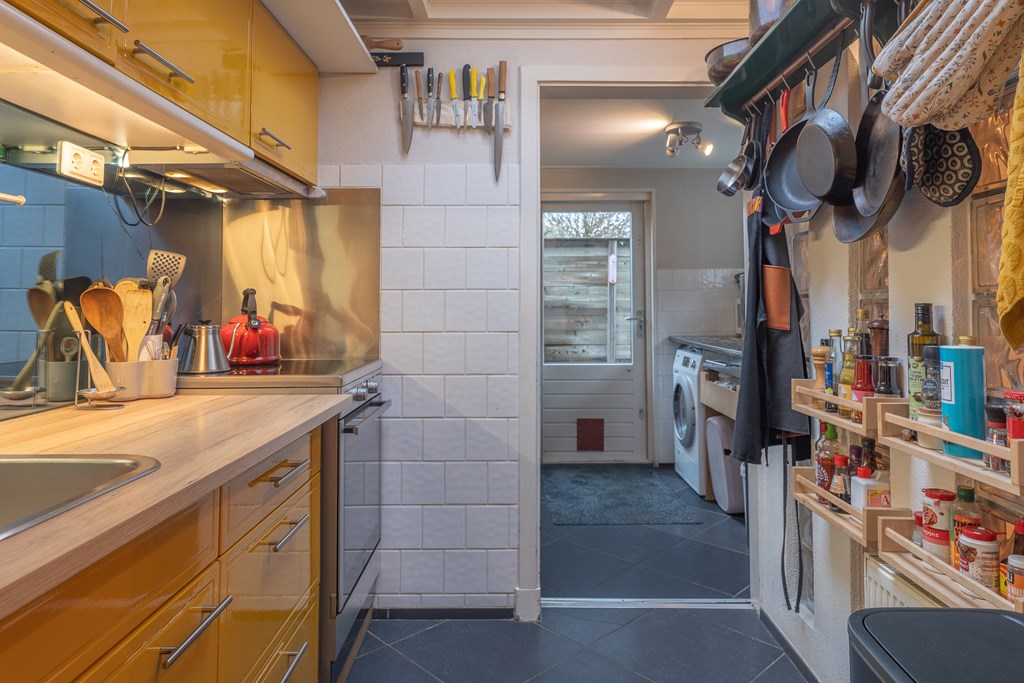 De afgesloten keuken is praktisch ingedeeld en voorzien van voldoende kastruimte, een kookplaat met oven en een spoelbak. Vanuit de keuken is de bijkeuken bereikbaar, waar extra opbergruimte en de wasmachineopstelling aanwezig zijn. Hier bevindt zich ook het toilet, dat in dezelfde stijl is uitgevoerd als de rest van de woning. Via de bijkeuken loopt u gemakkelijk de tuin in.