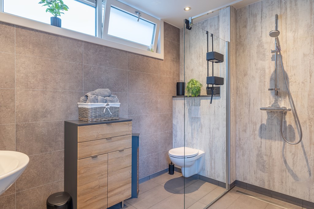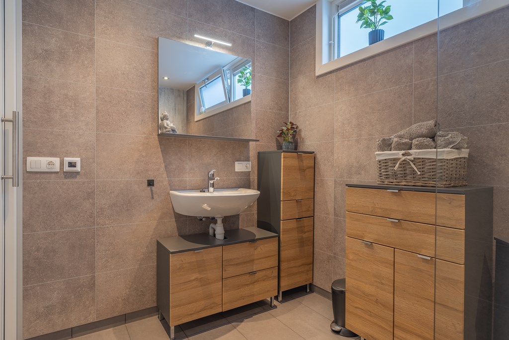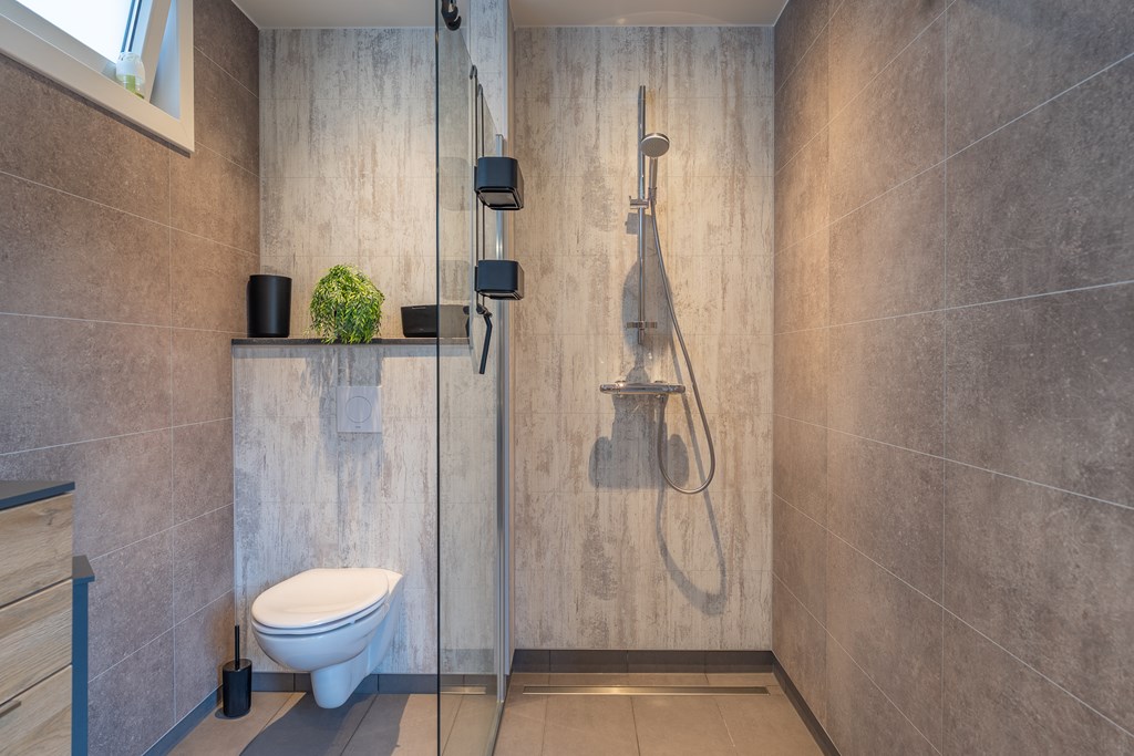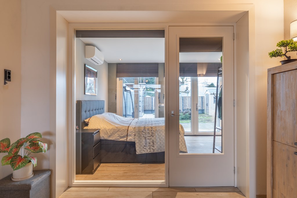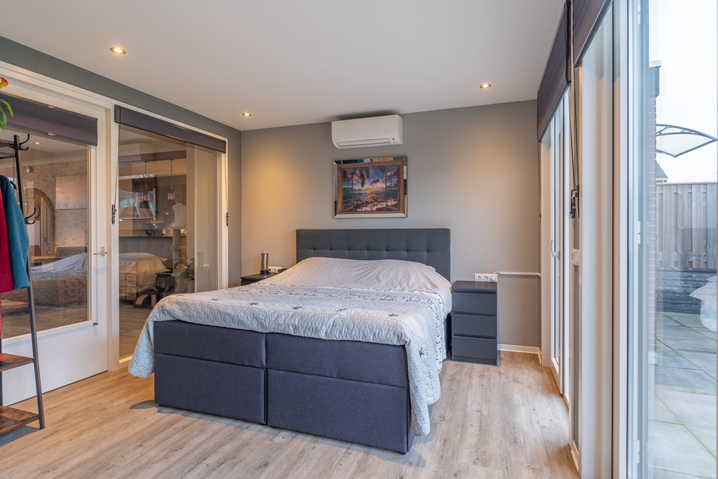 Aan de achterzijde van de woning bevindt zich de slaapkamer op de begane grond, met directe toegang tot de badkamer. Zowel de slaapkamer als de badkamer zijn voorzien van infrarood vloerverwarming, wat bijdraagt aan het comfort en het levensloopbestendige karakter van de woning.