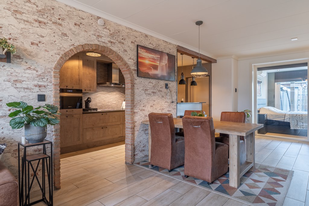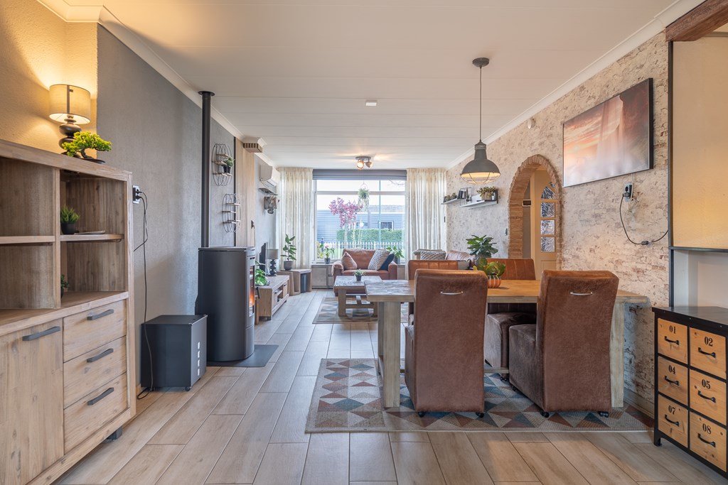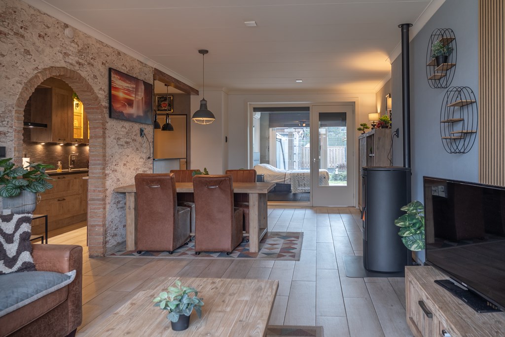 De woonkamer is ingedeeld met een zitgedeelte aan de voorzijde en een eetgedeelte richting de tuin. De ruimte is licht en prettig van formaat en biedt voldoende plaats voor een royale eettafel en een comfortabele zithoek.