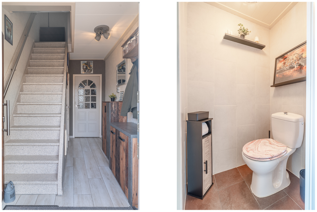Via de entree komt u binnen in de hal met toilet, trapopgang en trapkast. Vanuit de hal zijn direct zowel de keuken als de woonkamer bereikbaar, wat zorgt voor een logische en praktische indeling.