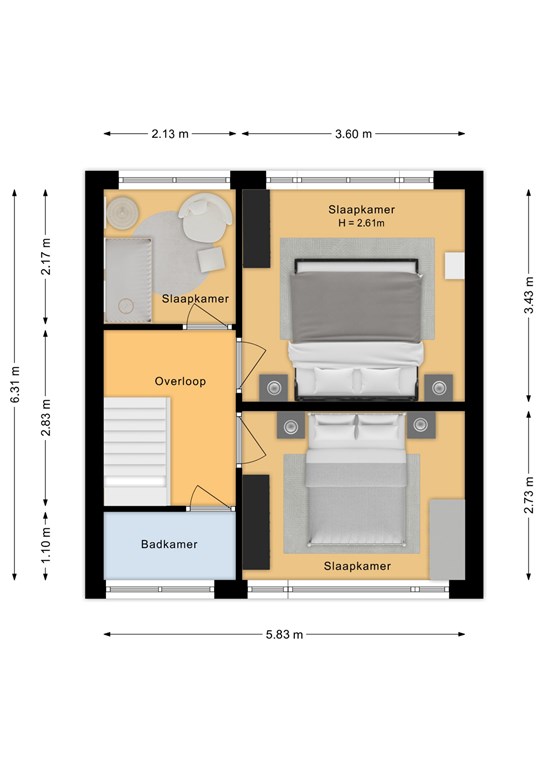 Op de eerste verdieping komt u uit op de overloop, die toegang biedt tot drie slaapkamers. Daarnaast is hier een tweede badkamer aanwezig. Deze ruimte is momenteel leeg en betreft de voormalige badkamerruimte, waardoor een nieuwe eigenaar deze geheel naar eigen wens kan invullen.
