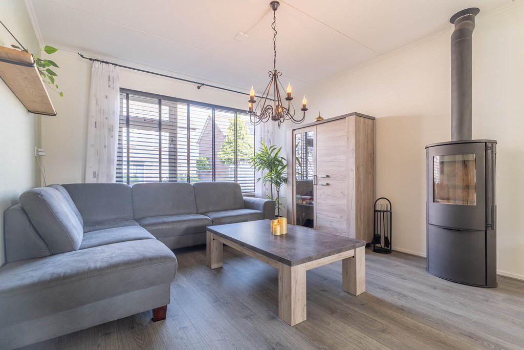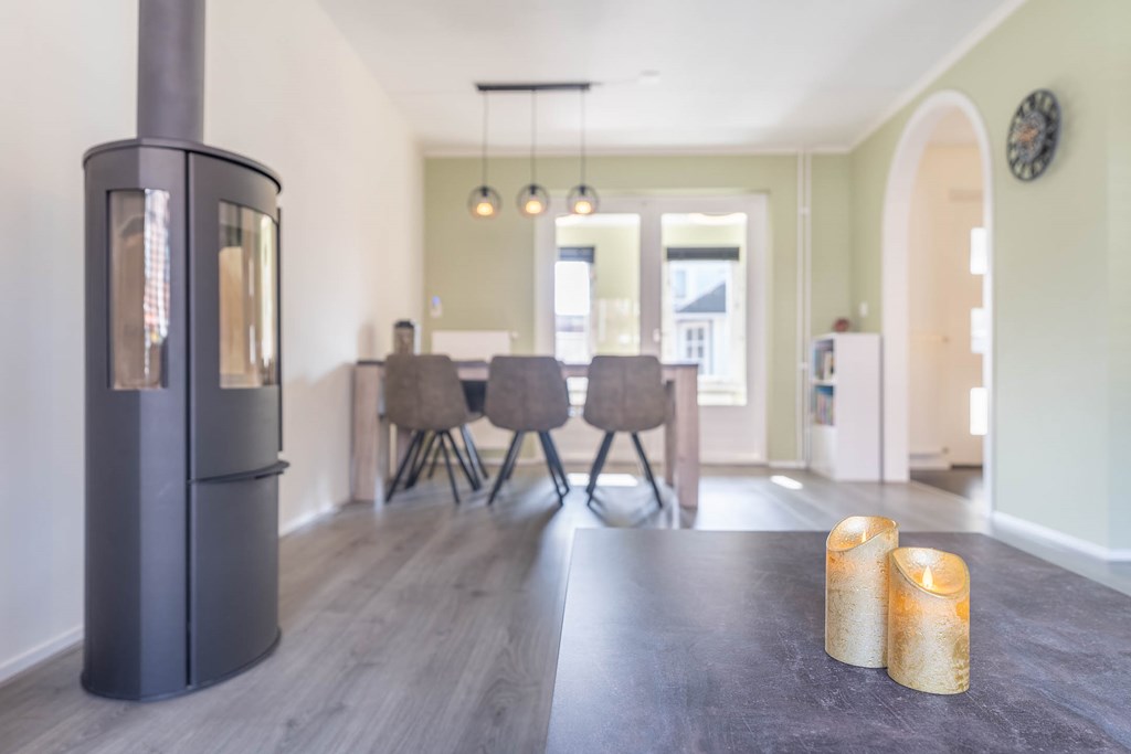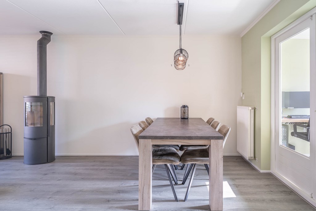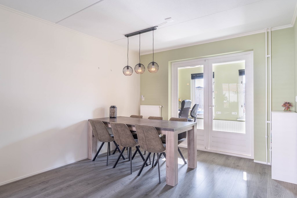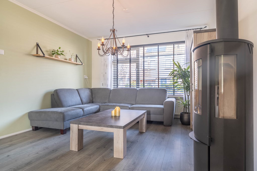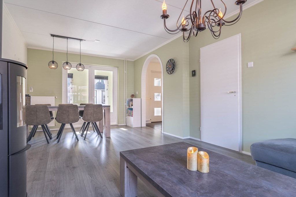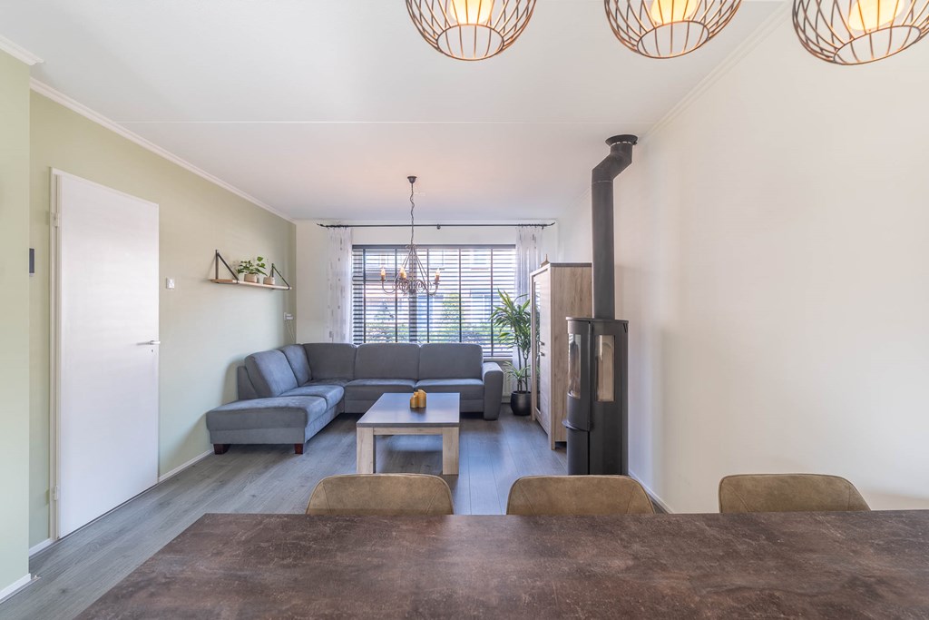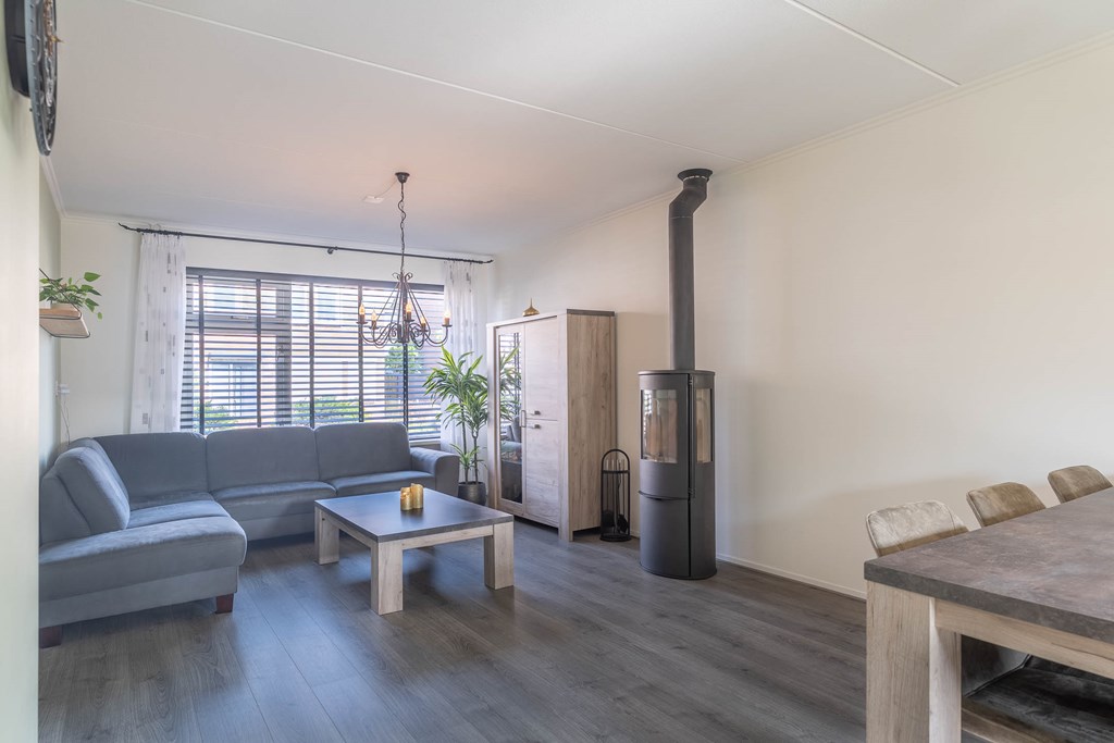 De woonkamer is uitgevoerd als een lichte doorzonwoonkamer met grote raampartijen aan zowel de voor- als achterzijde, waardoor er veel natuurlijk licht binnenvalt. Aan de voorzijde bevindt zich het zitgedeelte, terwijl aan de achterzijde ruimte is voor een eethoek.