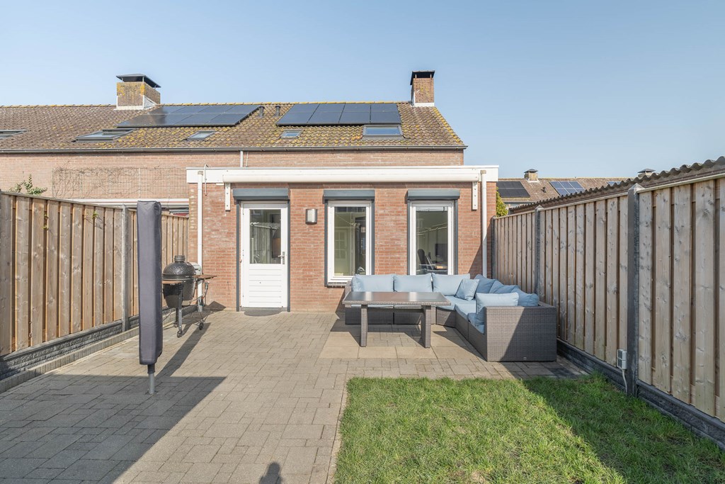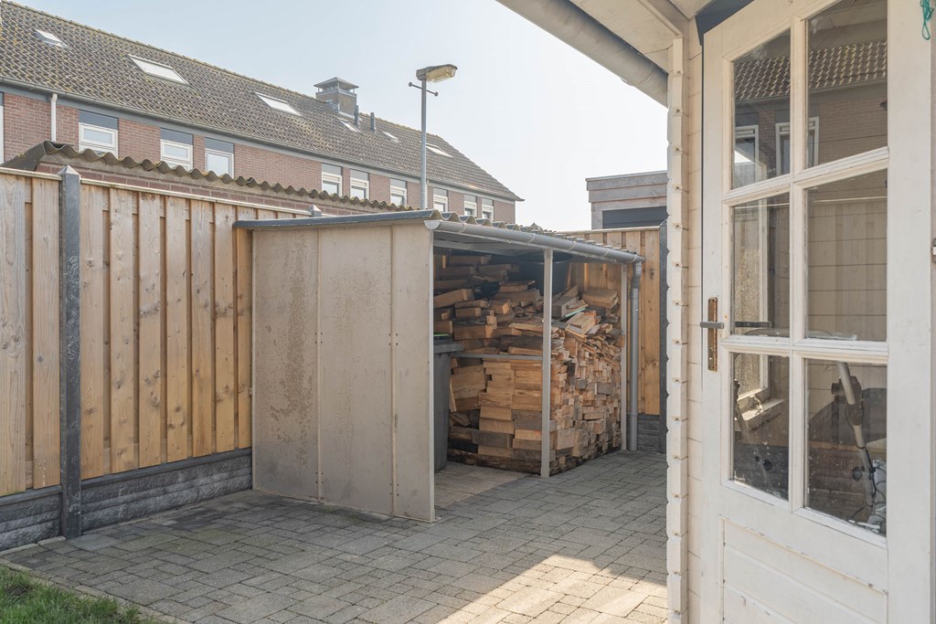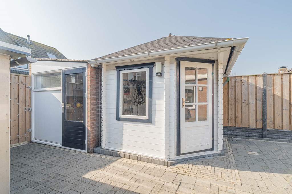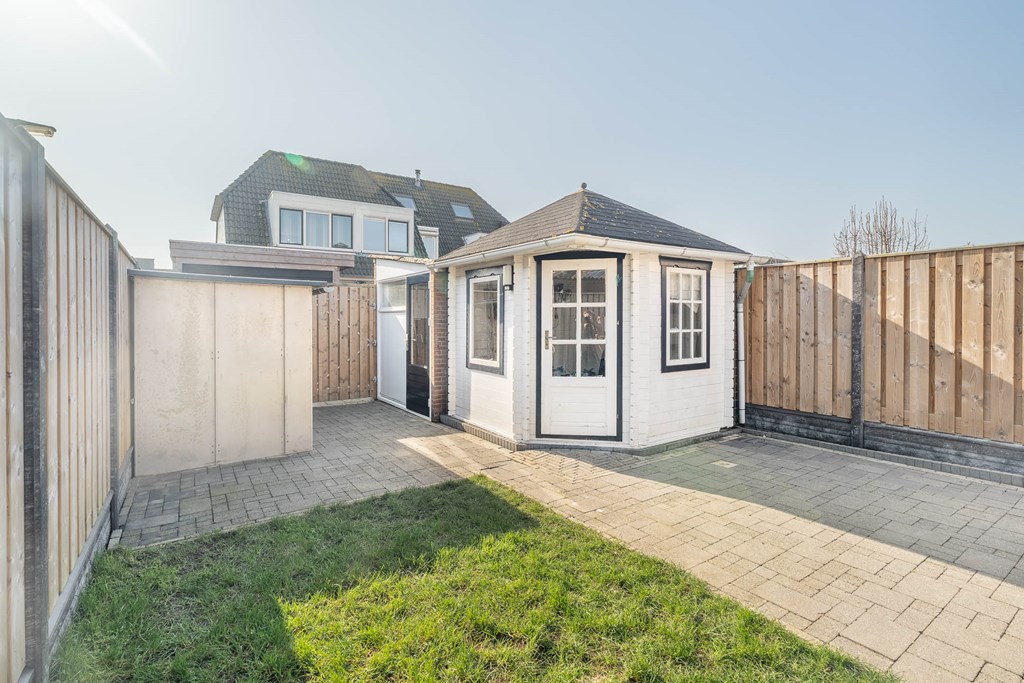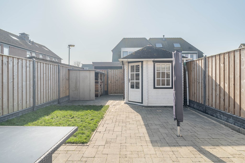 De achtertuin is verzorgd aangelegd en ligt op het zuidwesten. Hierdoor kunt u hier gedurende een groot deel van de dag van de zon genieten. Achter in de tuin staat een vrijstaande stenen berging, ideaal voor het stallen van fietsen en het opbergen van tuinspullen. Daarnaast beschikt de tuin over een achterom.
