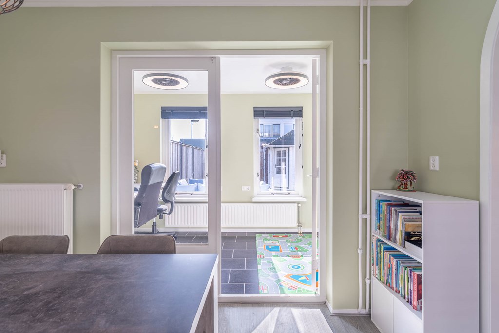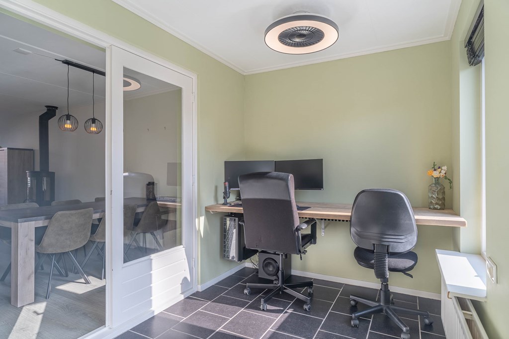 Aan de achterzijde van de woning bevindt zich een extra ruimte die via dubbele deuren vanuit de woonkamer bereikbaar is. Deze ruimte wordt momenteel gebruikt als werk- en hobbyruimte, is voorzien van vloerverwarming en zorgt voor extra comfortabele leefruimte op de begane grond.