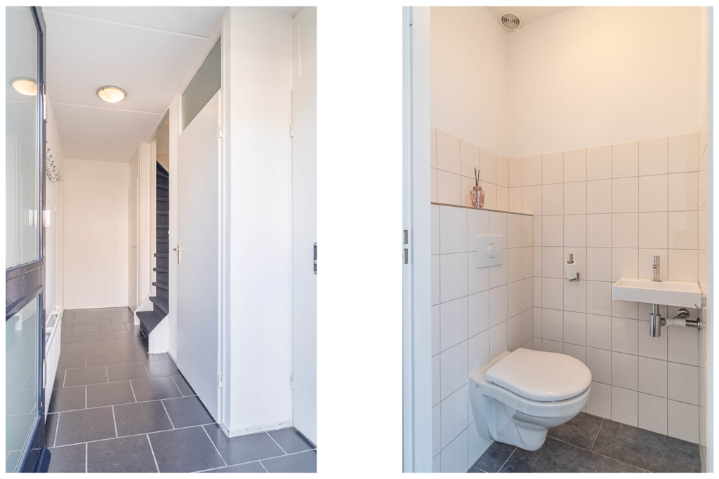 Via de entree komt u binnen in de hal met trapopgang naar de eerste verdieping en toegang tot het toilet. Vanuit de hal bereikt u de woonkamer.