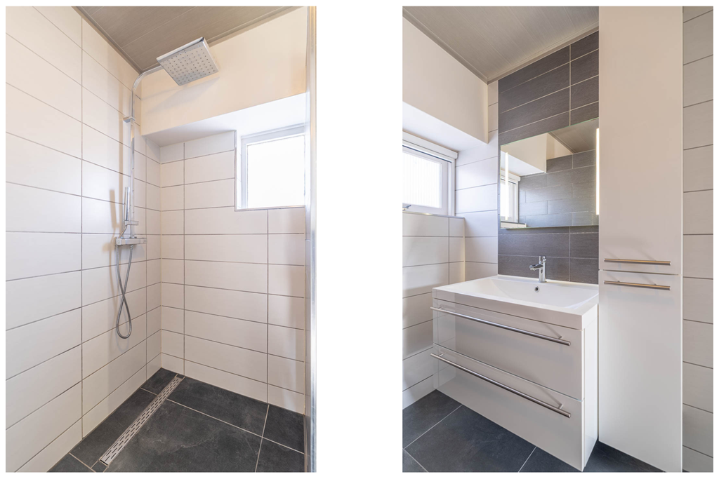 De badkamer is verzorgd uitgevoerd en beschikt over een ruime inloopdouche en een wastafel. Dankzij de praktische indeling biedt de badkamer voldoende comfort voor dagelijks gebruik.
