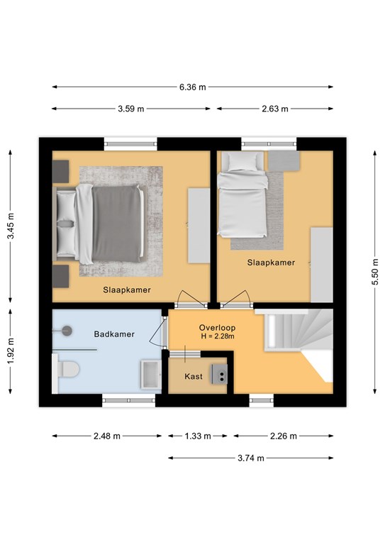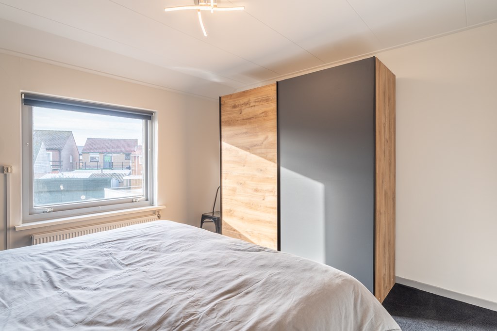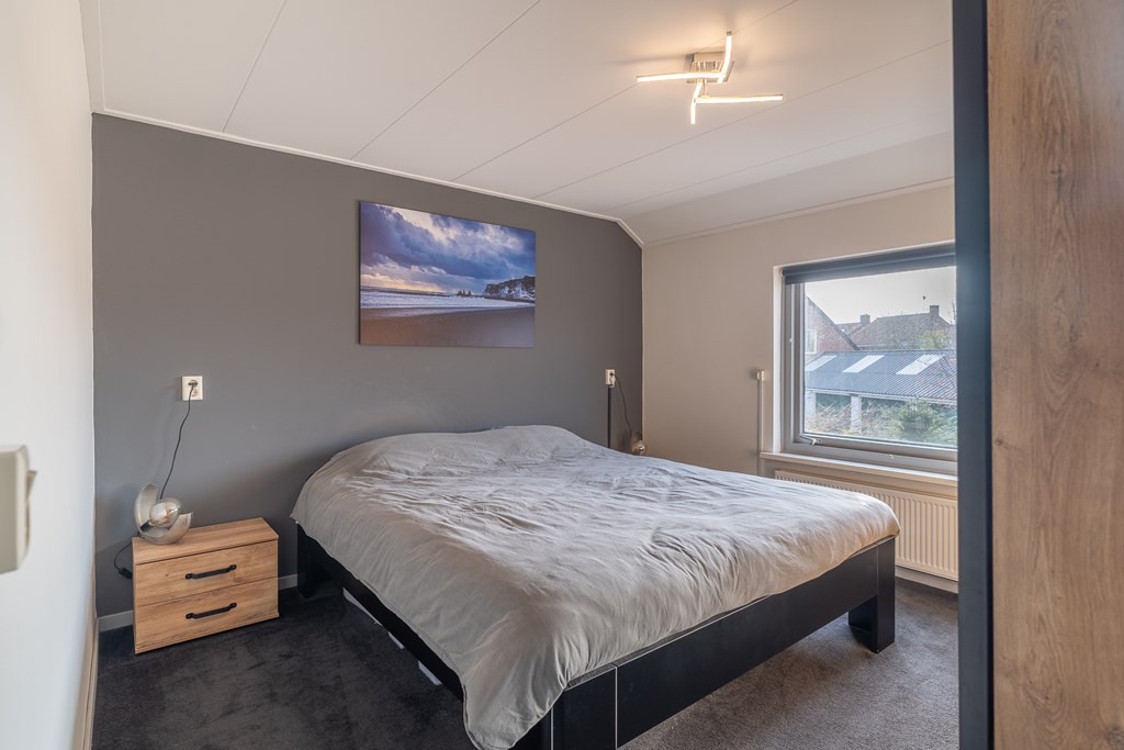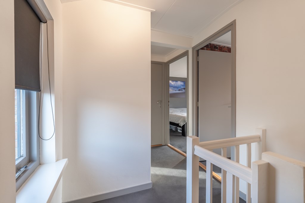 Op de eerste verdieping komt u uit op de overloop met toegang tot twee slaapkamers, de badkamer en een ruime bergkast. Beide slaapkamers zijn netjes afgewerkt en voorzien van veel natuurlijke lichtinval.