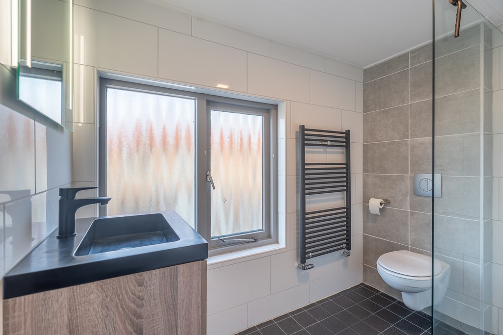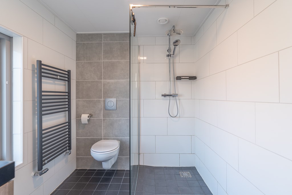 De badkamer is modern uitgevoerd en beschikt over een inloopdouche, wastafelmeubel en een tweede toilet.