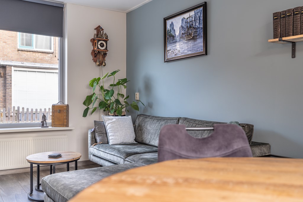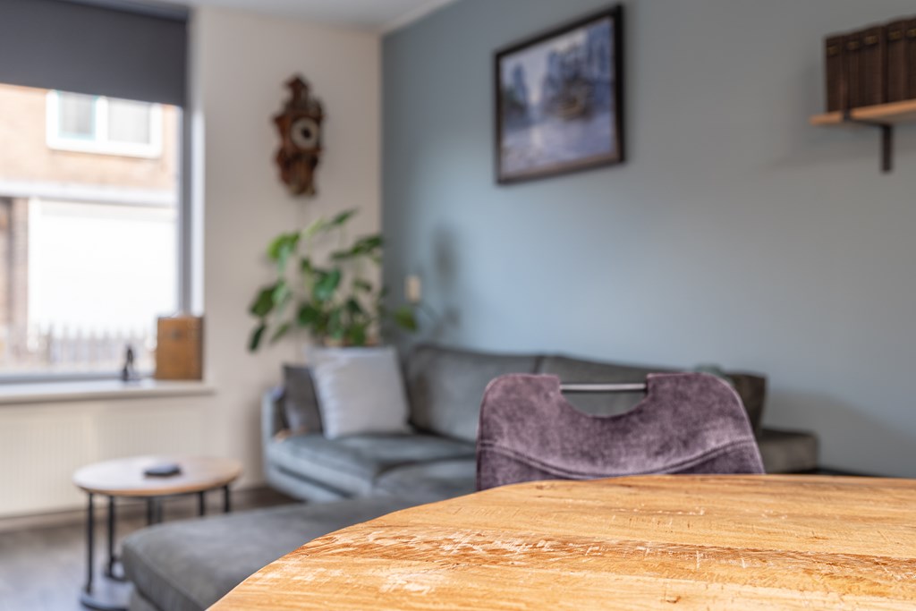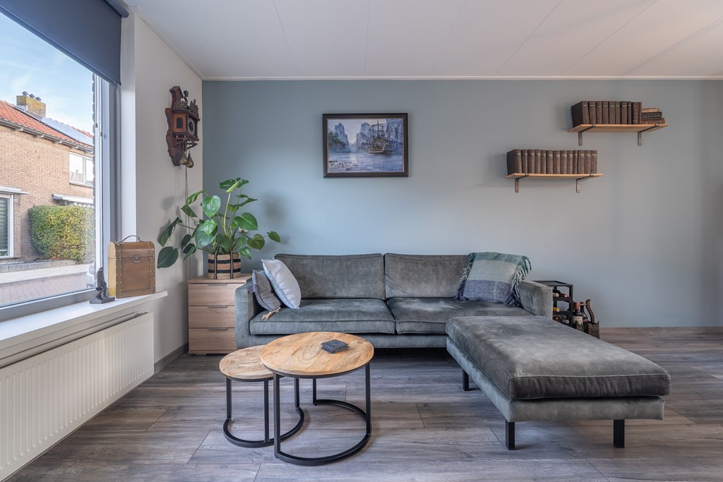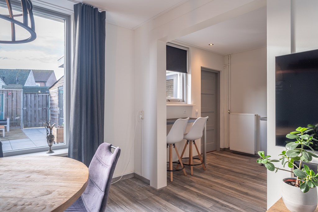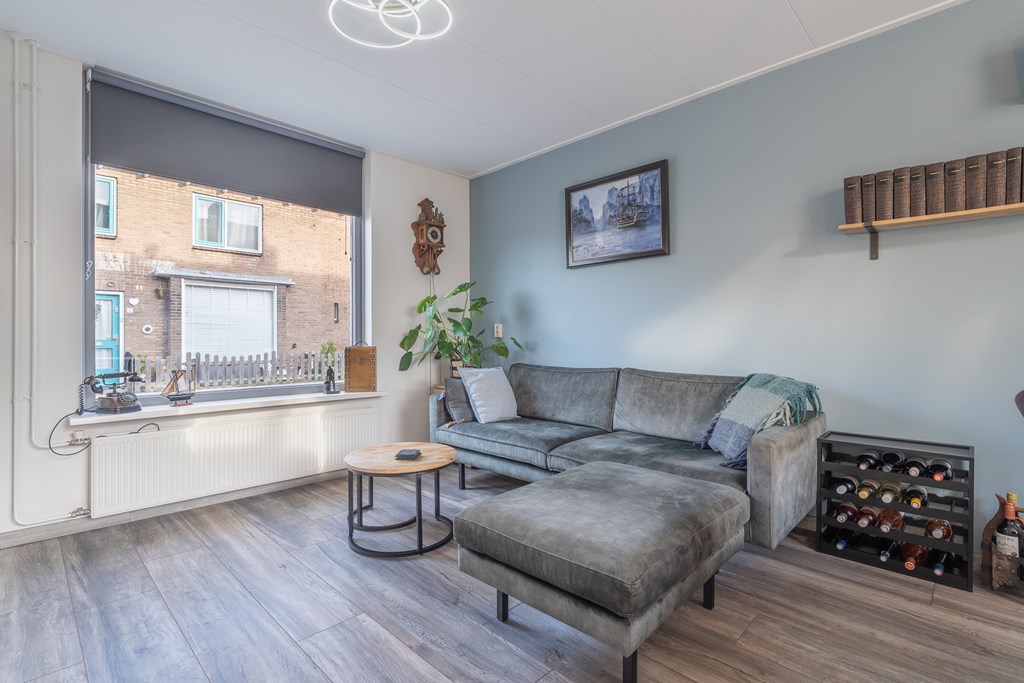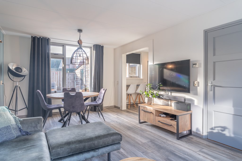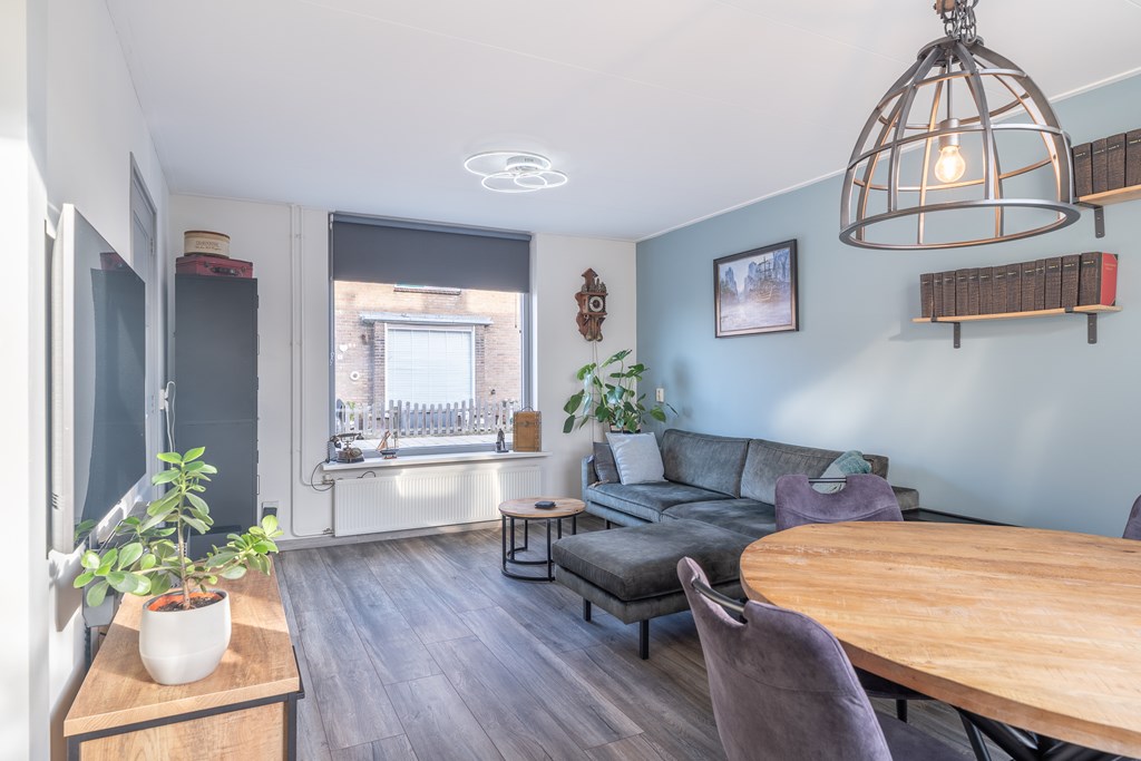 De woonkamer is gelegen aan de voorzijde van de woning en biedt ruimte voor zowel een zithoek als een eethoek. Dankzij de grote raampartij aan de voorzijde is er veel lichtinval, wat zorgt voor een prettige en open sfeer.