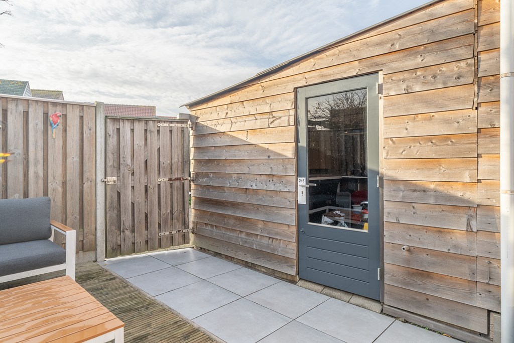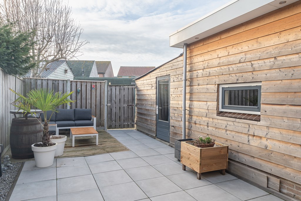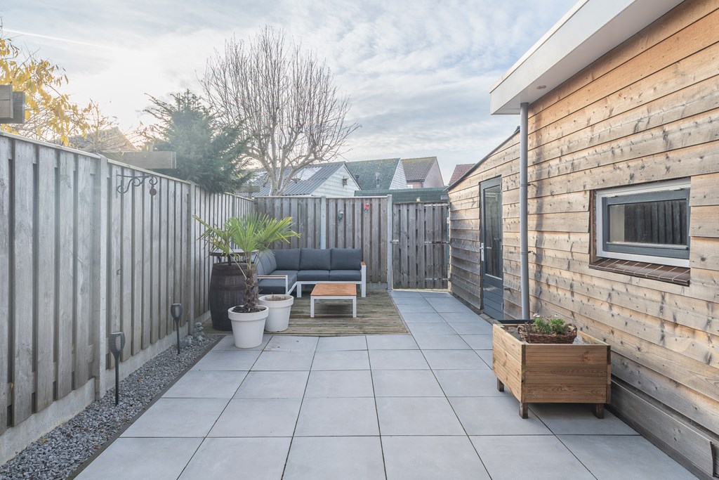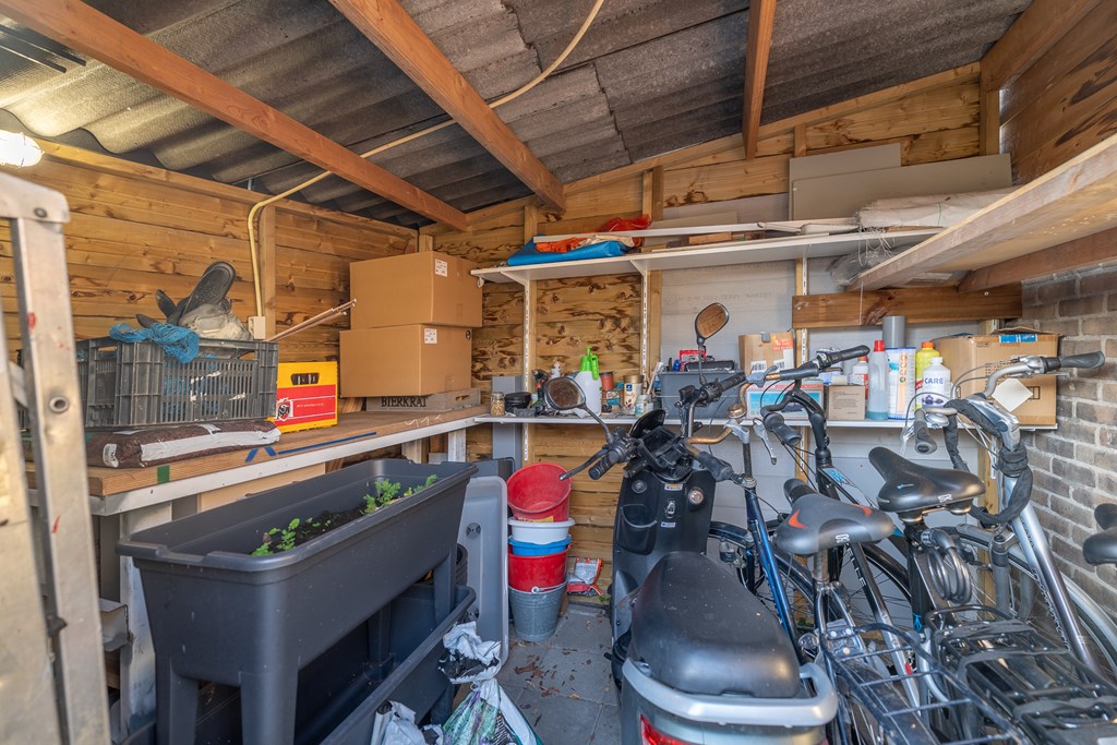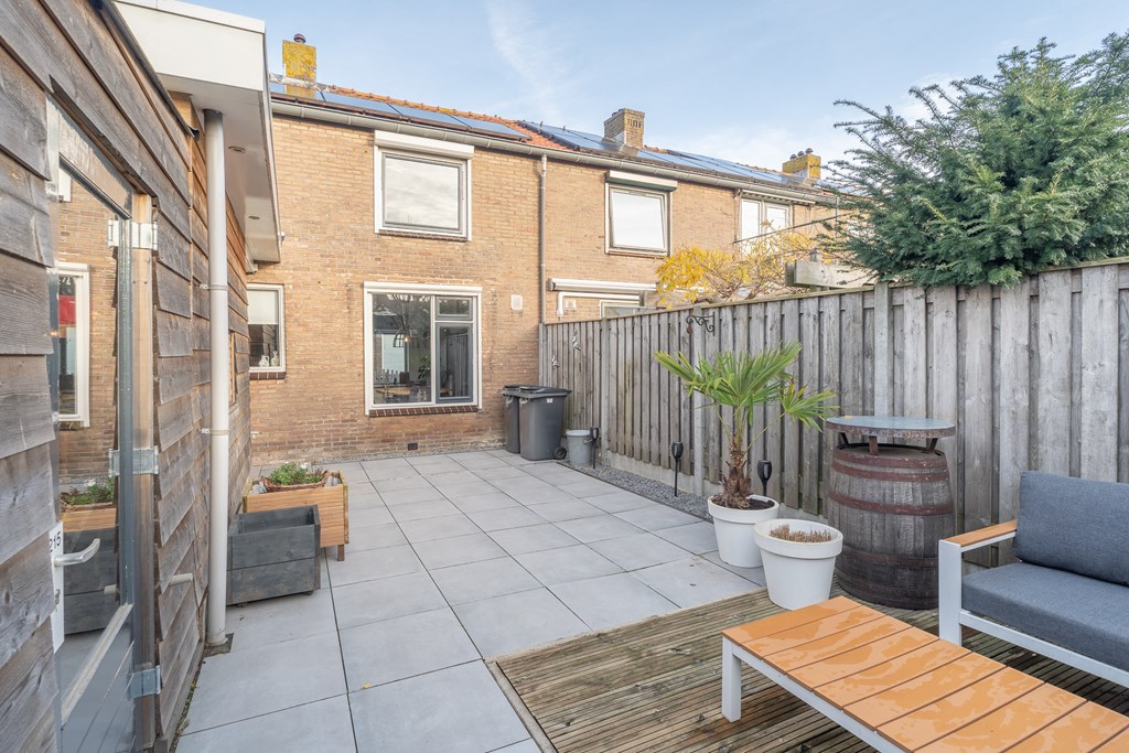 De achtertuin is onderhoudsvriendelijk aangelegd met bestrating en een houten terras. Er is voldoende ruimte om een fijne zitplek te creëren. Aan de woning grenst een berging, gelegen op eigen perceel en voorzien van elektra, ideaal voor het stallen van fietsen en het opbergen van tuinspullen. De tuin is tevens bereikbaar via een achterom.